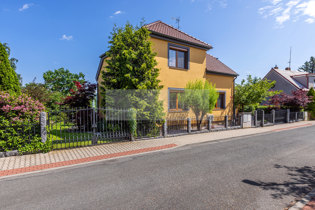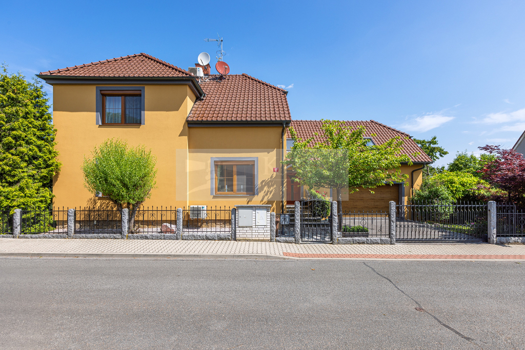 Již při příjezdu vás zaujme elegantní kovaný plot s masivními žulovými sloupky, který dodává celému domu reprezentativní charakter. Dálkově ovládaná vjezdová brána otevírá přístup k prostorné dvojgaráži, která zajišťuje komfortní parkování pro dvě auta a dostatek místa pro další vybavení.