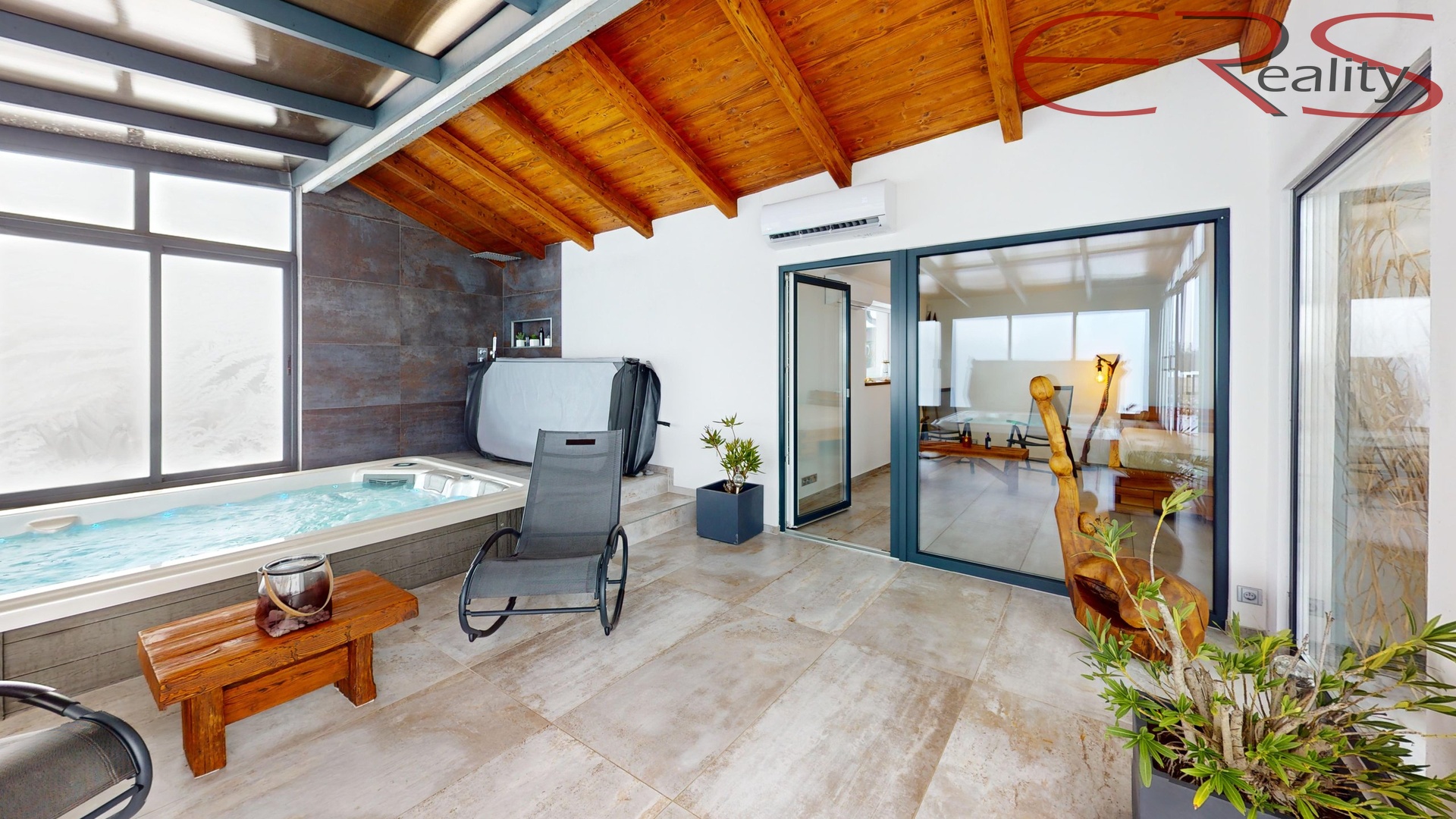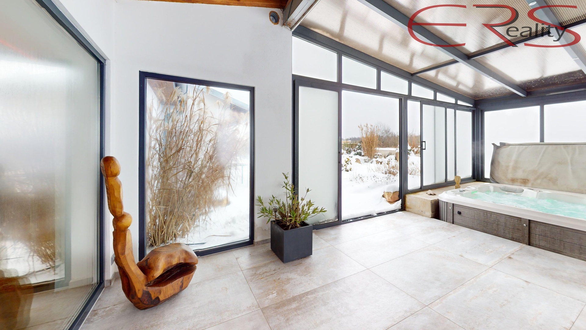 Dominantou objektu je prosklená wellness část o ploše cca 54 m², kde je vířivka pro 5 osob a Swimm Spa s protiproudem (plavání, masáže, jemný sprinkel). Velkou předností je možnost otevřít prosklenou část po celé ploše, takže v létě funguje jako vzdušná terasa a v zimě jako útulný vyhřívaný „zimní pavilon“ se světlem a výhledem.