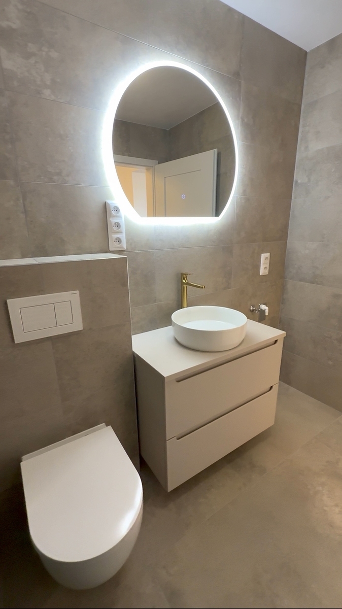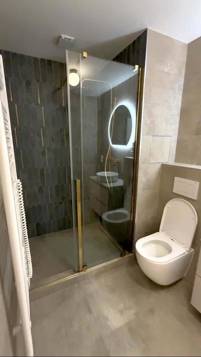 Koupelna je moderní a praktická – najdete zde prostorný sprchový kout o rozměrech 120 × 80 cm, toaletu, umyvadlovou skříňku a zrcadlo s možností volby odstínů osvětlení, které podtrhuje příjemnou atmosféru.
