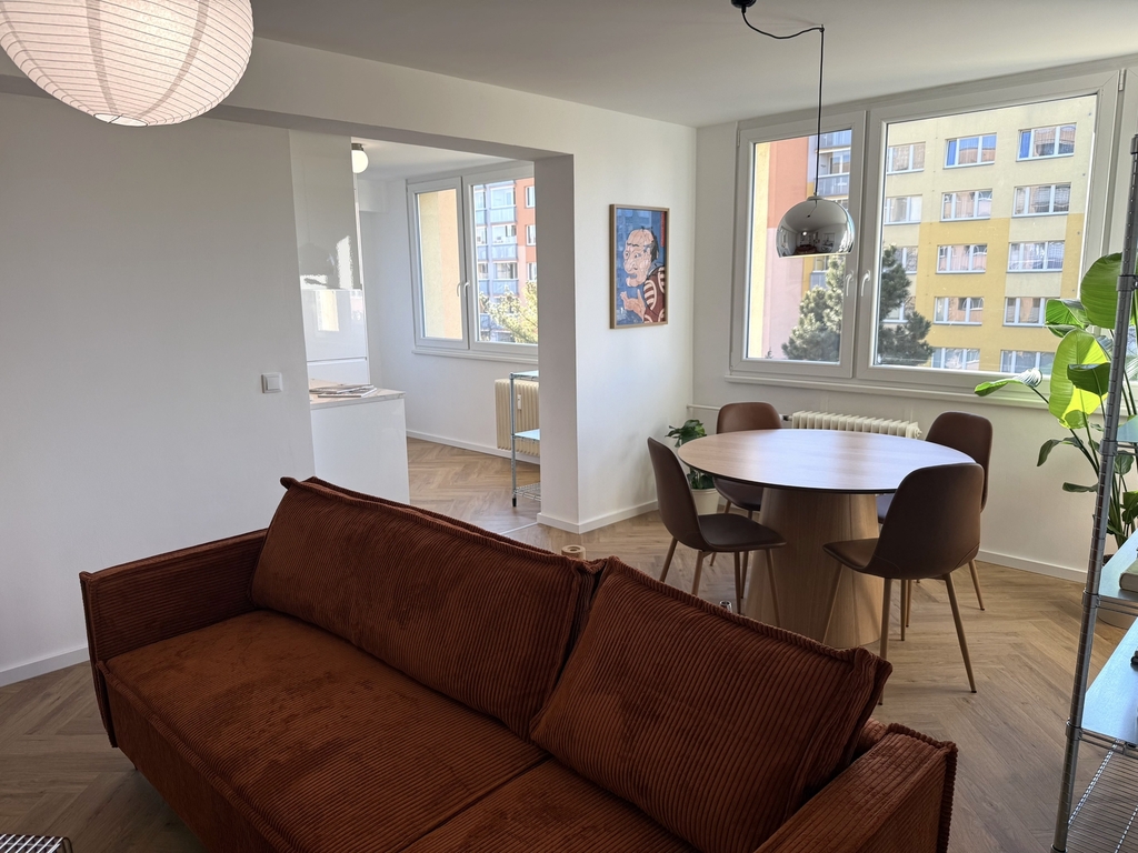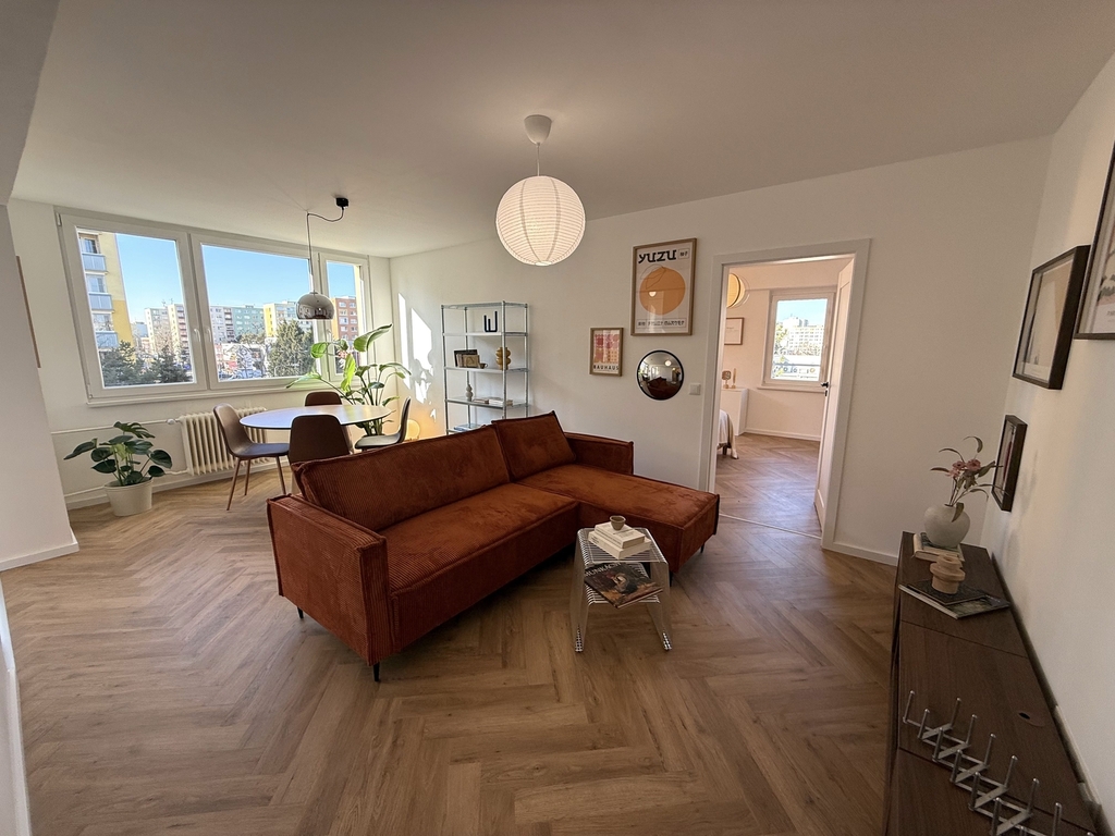 Rád Vám nabízím k pronájmu nadstandardní, kompletně a nově zrekonstruovaný byt o dispozici 2+kk, který se nachází ve 4. nadzemním podlaží panelového domu s výtahem. Celková plocha bytu činí 65,7 m², k bytu náleží lodžie a sklep.