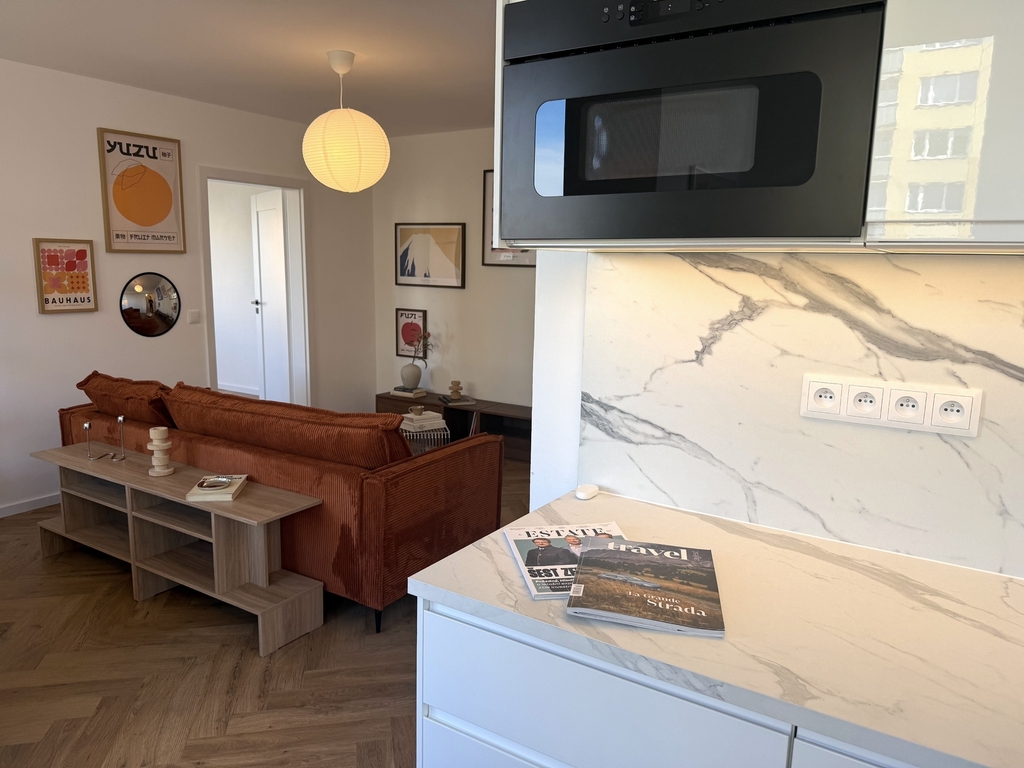 Na obývací část plynule navazuje kuchyňská linka, která je plně vybavena vestavnými spotřebiči – troubou, indukční varnou deskou, myčkou nádobí (60 cm), vestavěnou digestoří a lednicí s mrazákem. Veškeré vybavení v bytě je zcela nové.