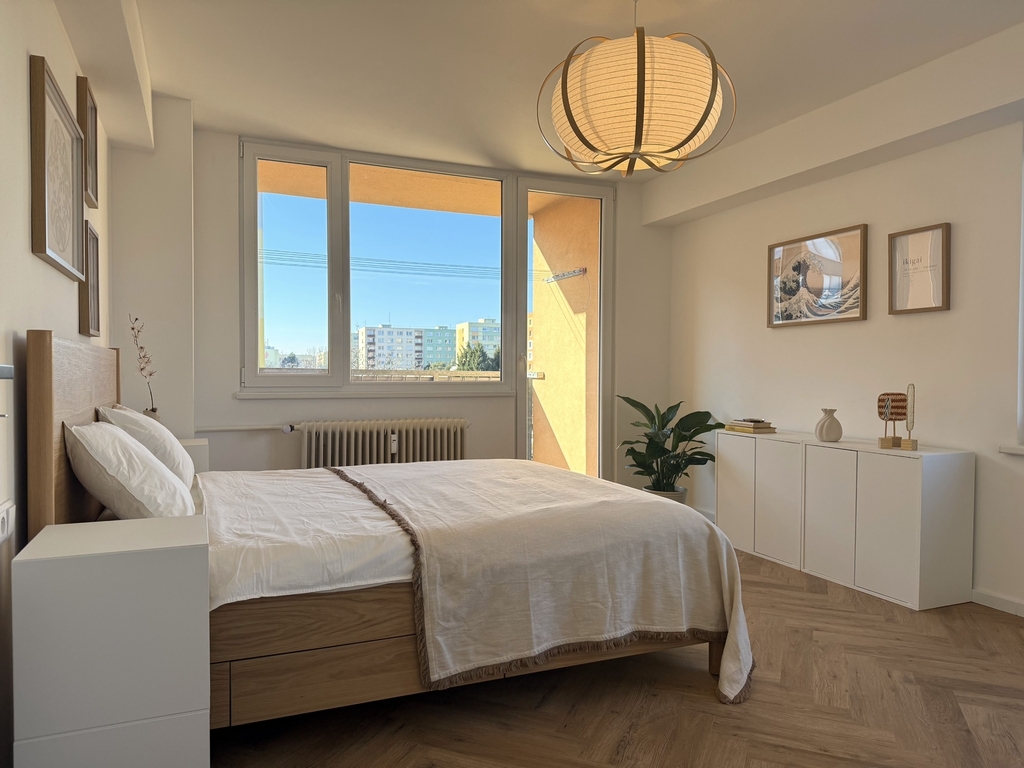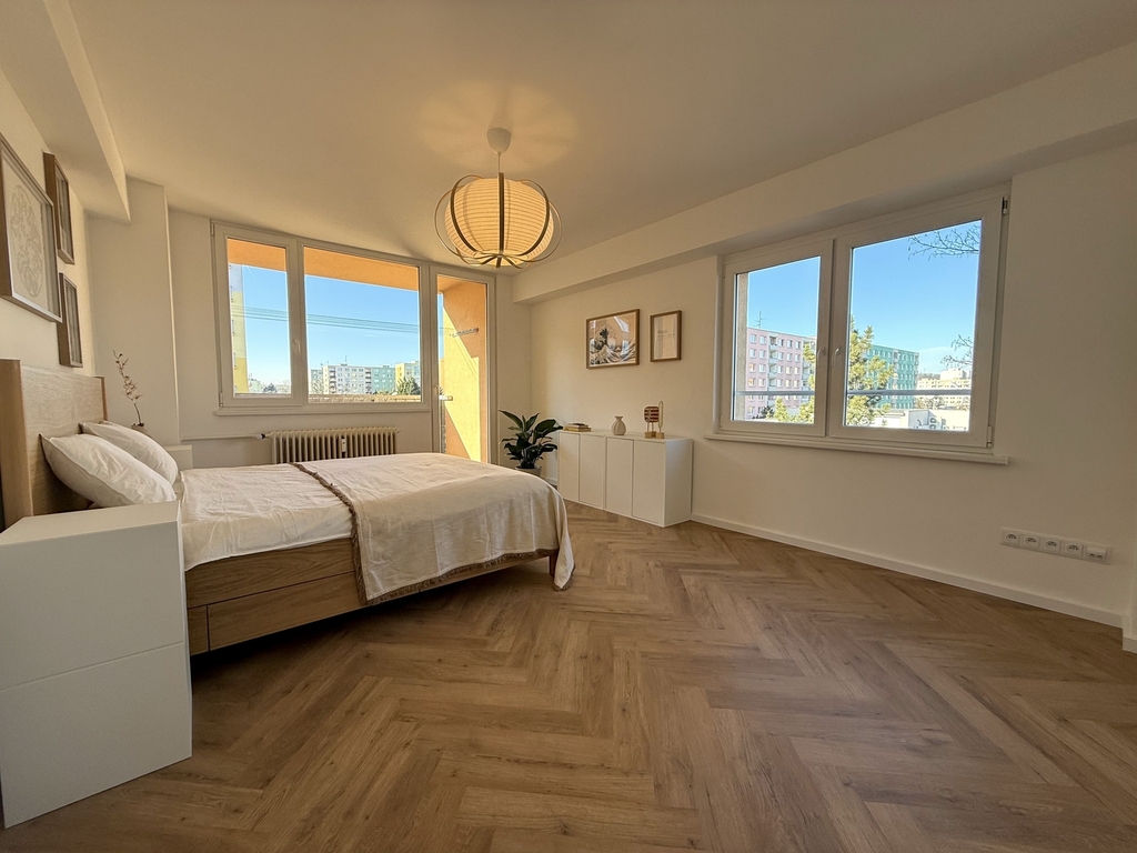 Ložnice je vybavena postelí o rozměru 160 × 200 cm s novou matrací a nočními stolky. Prostor je navržen velmi prakticky – nabízí dostatek místa nejen pro šatní skříně, ale také dětskou postýlku či pracovní kout. Z ložnice je přímý vstup na samostatnou lodžii o výměře 4 m², ideální pro ranní kávu či relax.