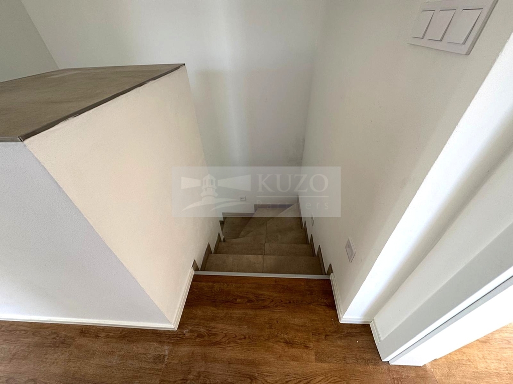 Podlahy v přízemí pokrývá praktická dlažba. V patře je podlaha z vinylové krytiny v barvě světlého dubu, která je odolná a snadná na údržbu. Interiérové dveře a obložky jsou provedeny v bílé barvě, což podtrhuje čistý a moderní vzhled interiéru. Kuchyň je vybavená kuchyňskou linkou s vestavnými spotřebiči.