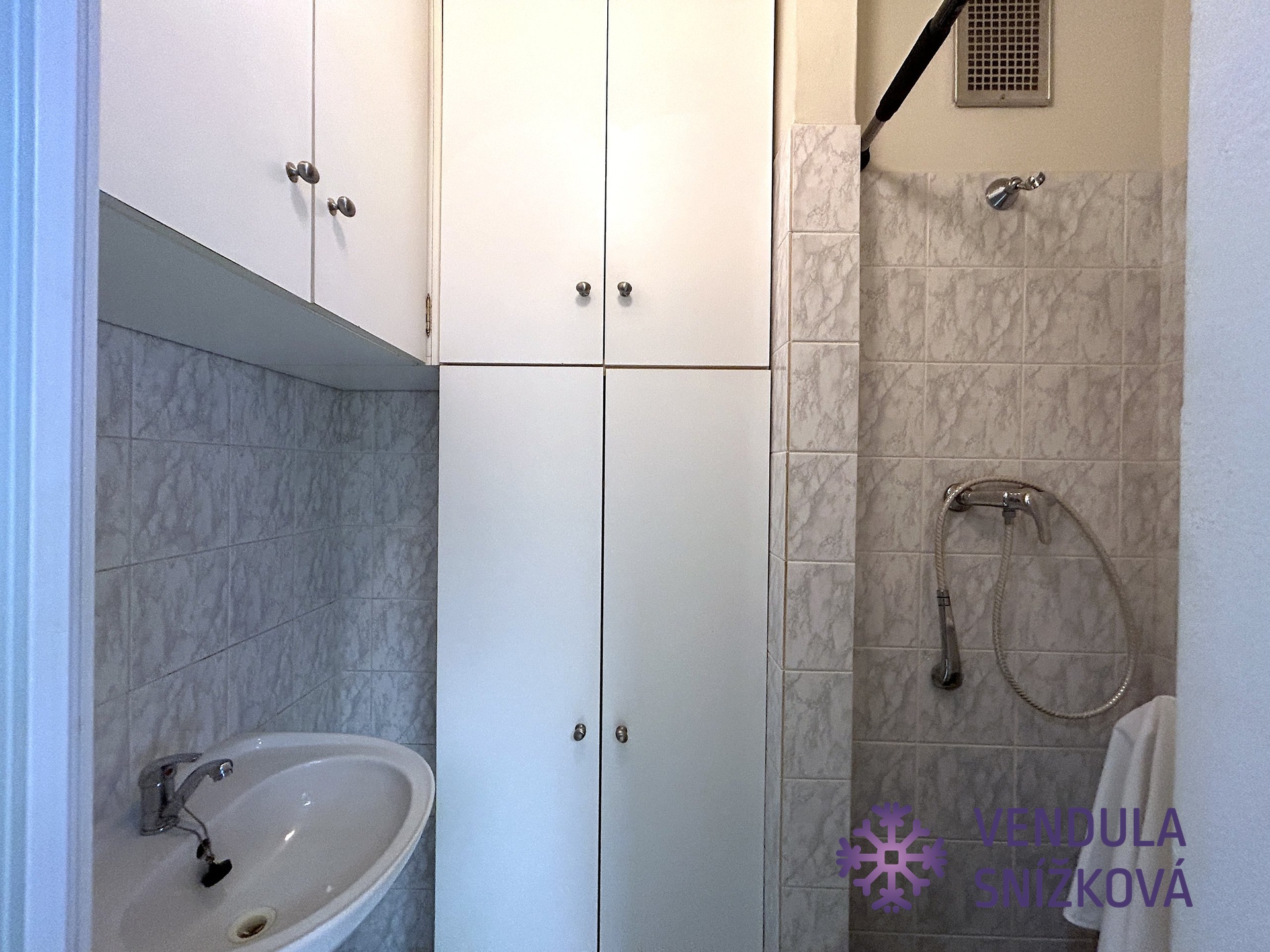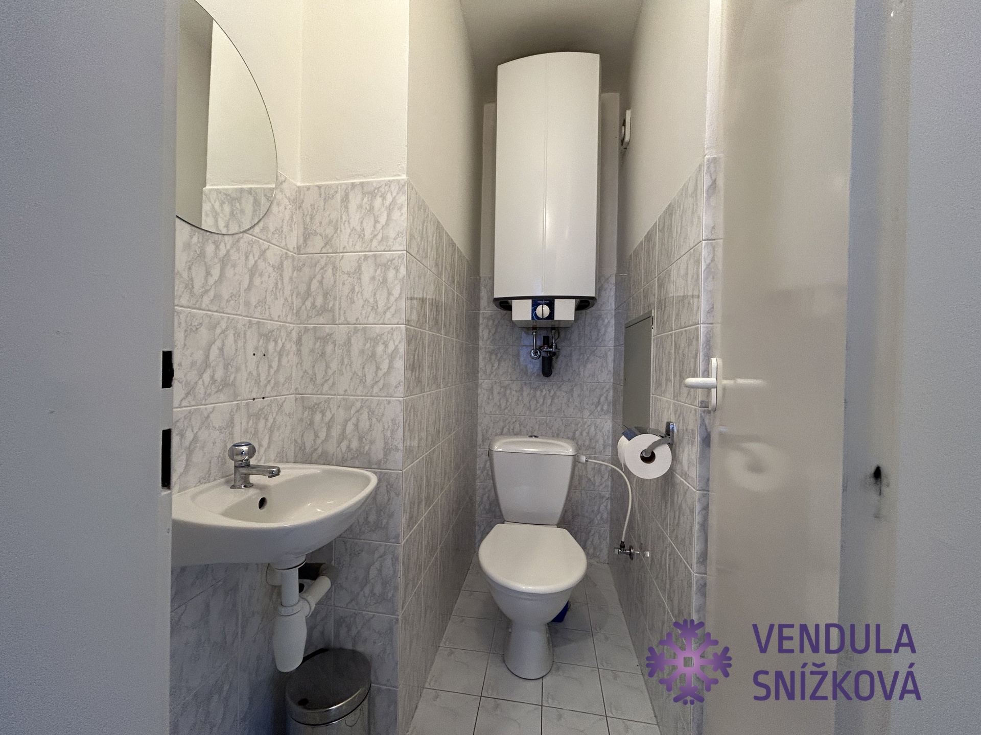 Dispozice prostoru zahrnuje vstupní chodbu, kterou lze využít jako pohodlnou čekárnu pro klienty, dále hlavní místnost, samostatnou toaletu a zázemí s kuchyňkou, sprchovým koutem a vestavěnými skříněmi.