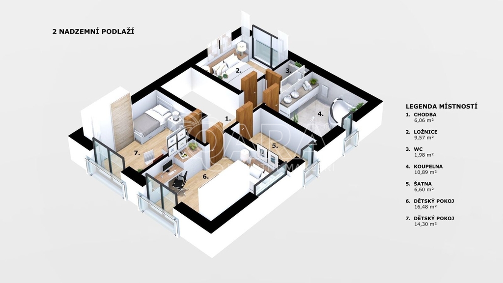 * Horní patro: ložnice, dva dětské pokoje, šatna, koupelna a samostatné WC.