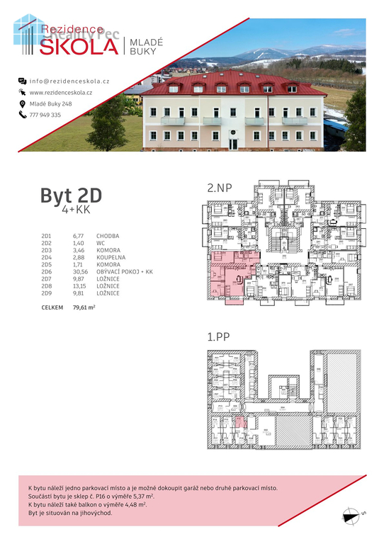 Exkluzivně nabízíme prodej bytu 4+kk s užitnou plochou 79,61 m2 byt se nachází v moderním rezidenčním projektu v centru obce Mladé Buky. Nově zrekonstruovaná budova "staré školy" se přeměnila na bytový dům s 28 byty. Dům s výtahem zajišťuje pohodlné bydlení pro všechny věkové skupiny. Díky kvalitnímu provedení a nízkým nákladům na provoz nabízí ideální podmínky pro každodenní život. Byt je navržen s důrazem na komfort a funkčnost. Byt se nachází ve 2.NP s balkónem orientovaným na jihovýchod, parkovací stání a sklepní kóje jsou samozřejmostí. Nabízí se i možnost dokoupení garáže.