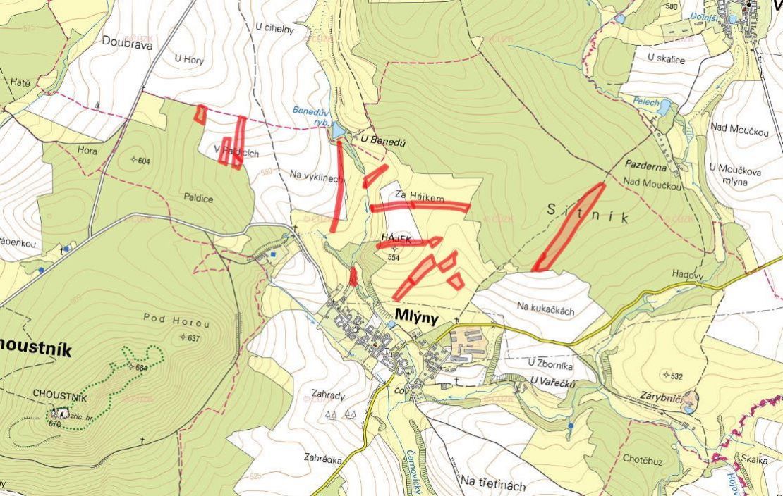 K prodeji je půda na pozemcích parc. č. 69, 792, 803, 867, 896/6, 896/9, 896/13, 915, 921, 953, 954, 961, 1007/16, 1007/17, 1007/18, 1007/41, 1095/7, 1136, 1139, 1143 a 1155 zapsaných na LV 169 v KÚ Mlýny u Choustníku.