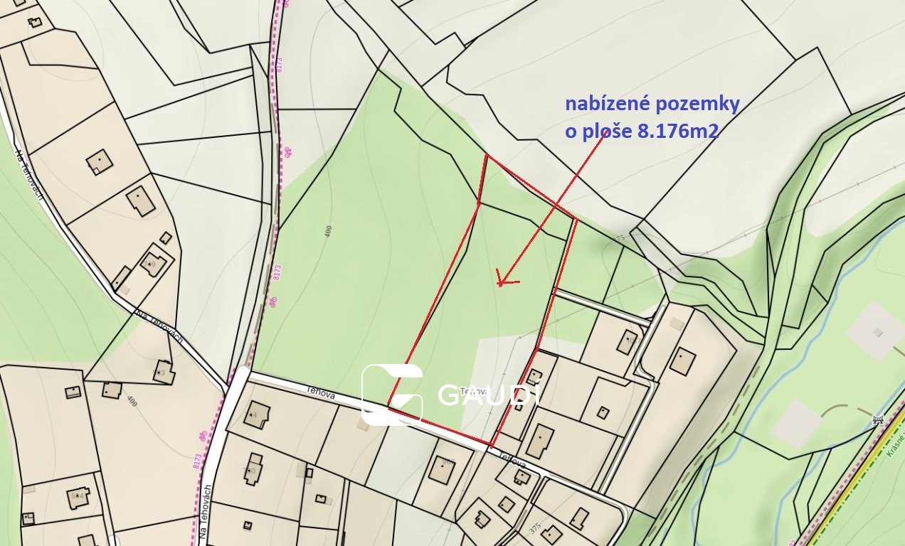 Nabízená plocha je složena ze dvou vedle sebe sousedících pozemků 7.216m2 a 960m2 = celkem 8.176m2, orientačně obdélníkového tvaru cca 62 x 135m.