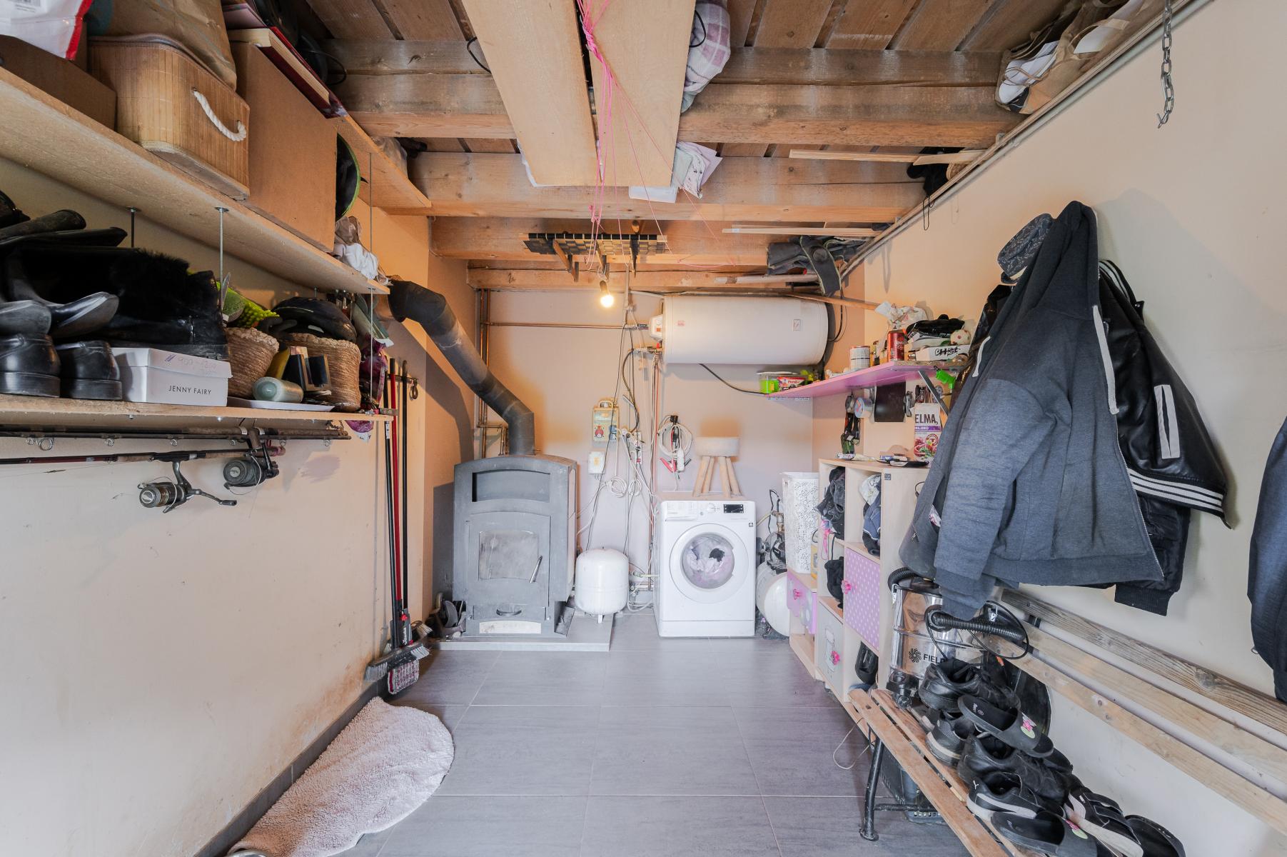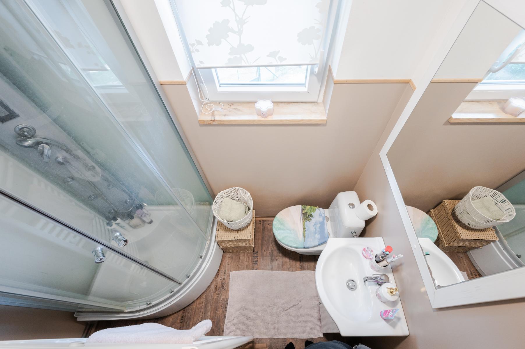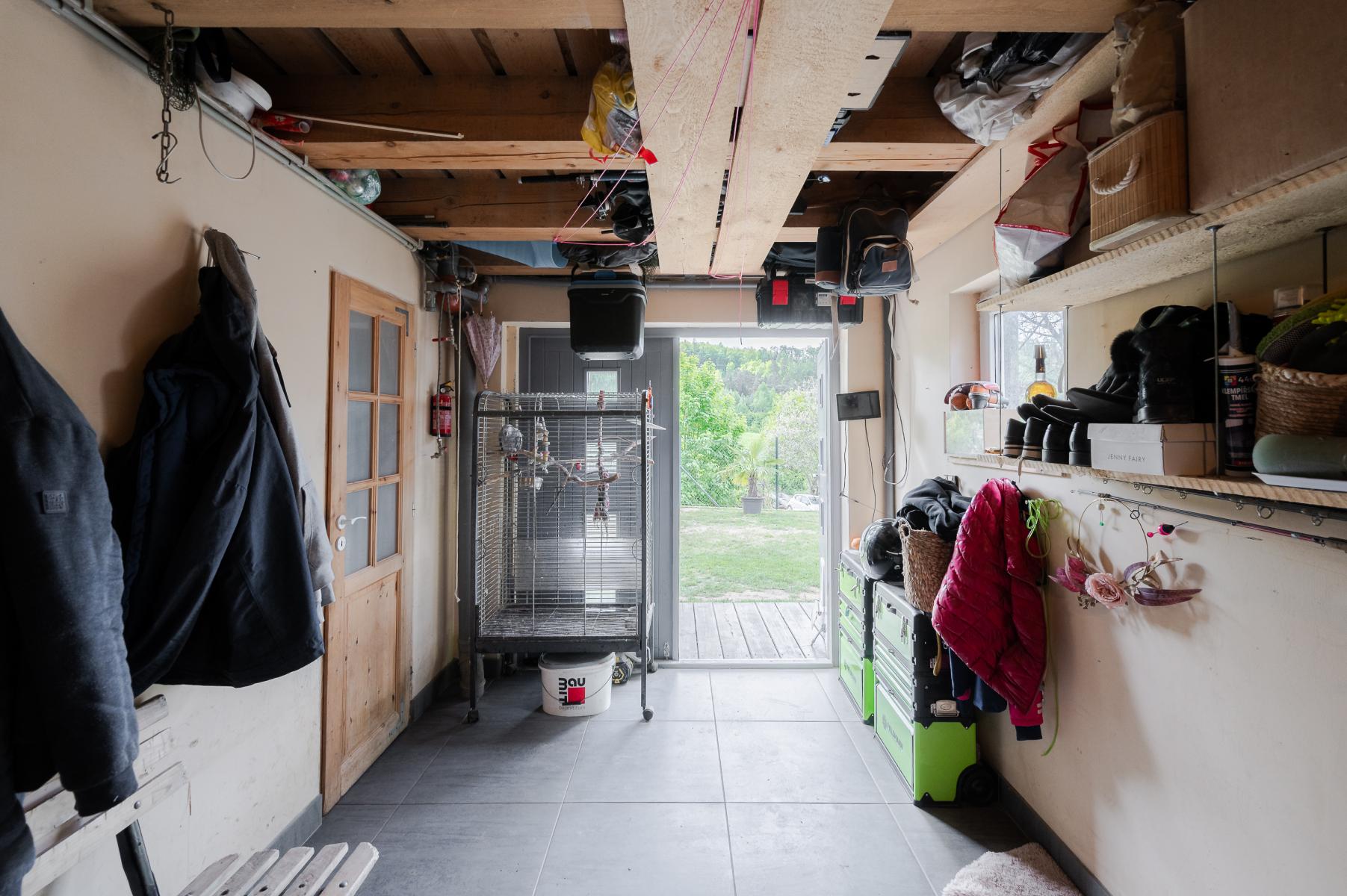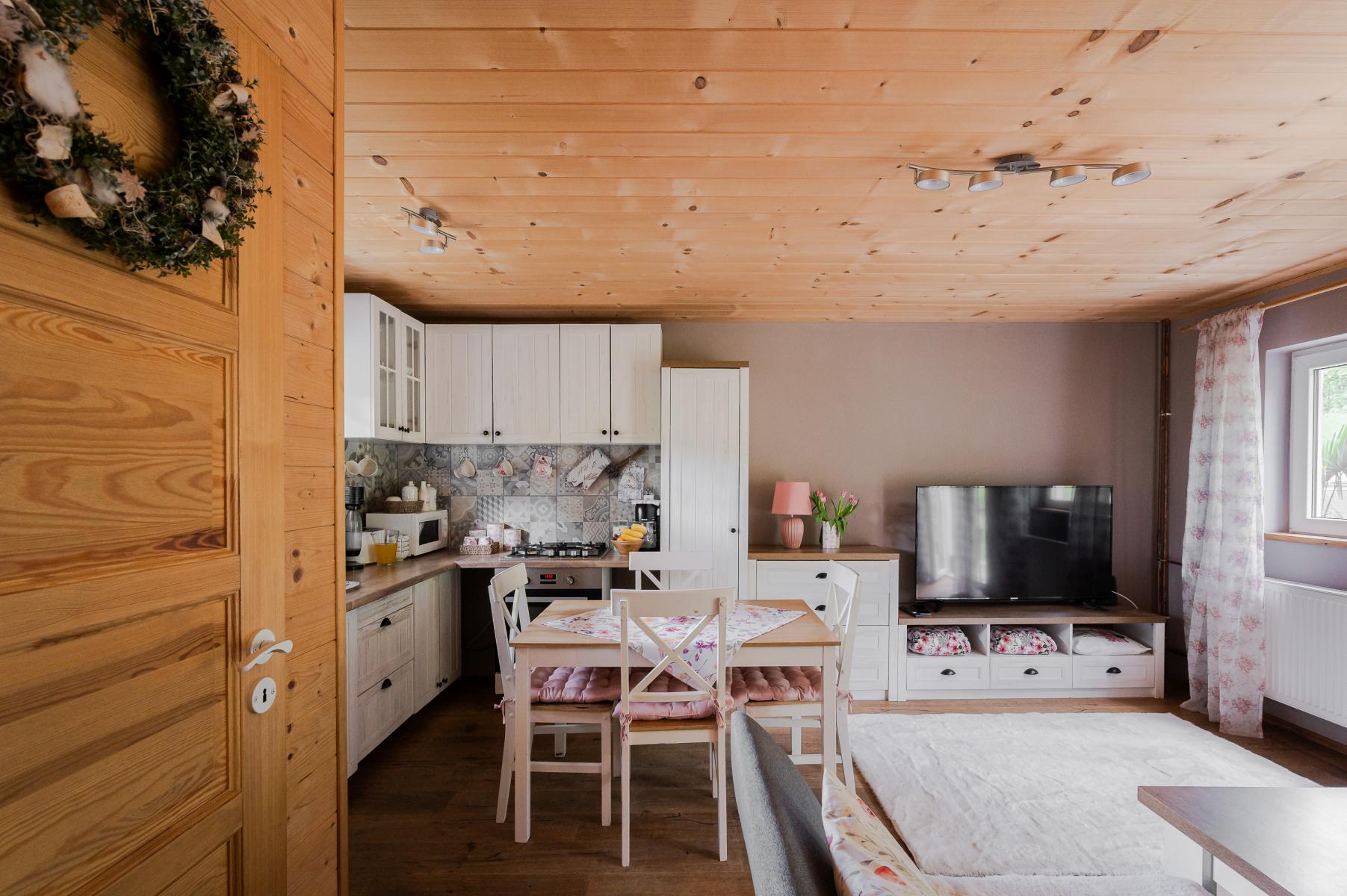 V přízemí se nachází vstupní předsíň, ložnice, garáž/technická místnost a přímý vstup na zahradu. Hlavní obytné podlaží nabízí prostorný obývací pokoj s vybaveným kuchyňským koutem, koupelnu se sprchovým koutem a francouzské okno vedoucí na terasu a zahradu. Podkroví lze využít jako další pokoj či dětský prostor.