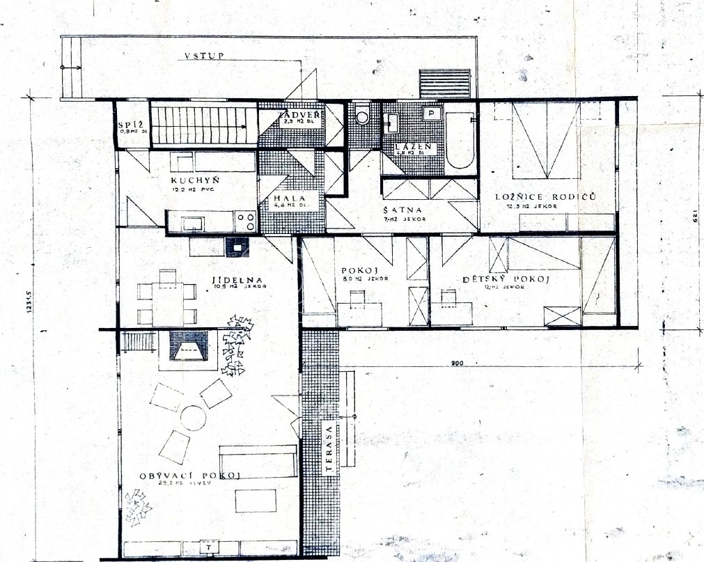 V 1PP je garáž další technické zázemí, velký pokoj, koupelna a toaleta o celkové ploše 42 m2. 1NP nabízí tři ložnice, kuchyň, obývací pokoj se samostatnou jídelnou, špajz, koupelnu a toaletu o celkové ploše 103m2.