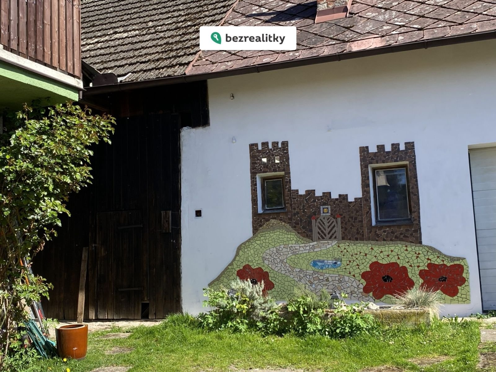 Má natřenou střechu, okapy, zachovalou omítku, nový plot a mozaiku s tématem Trosek.