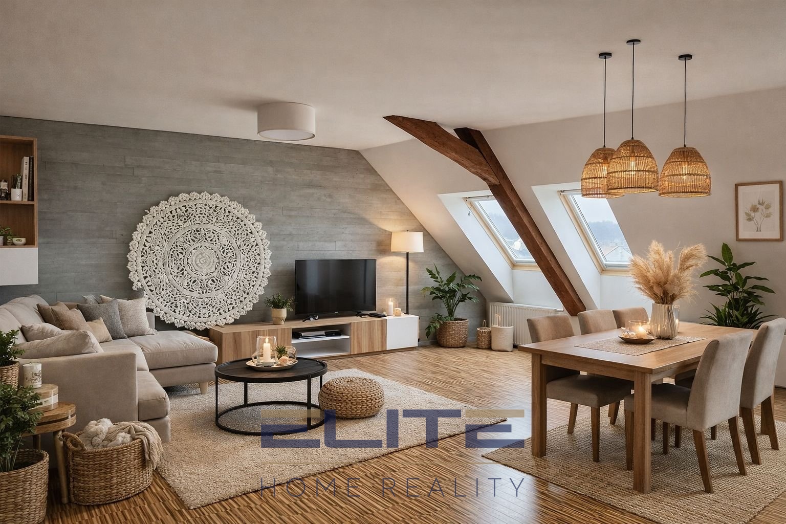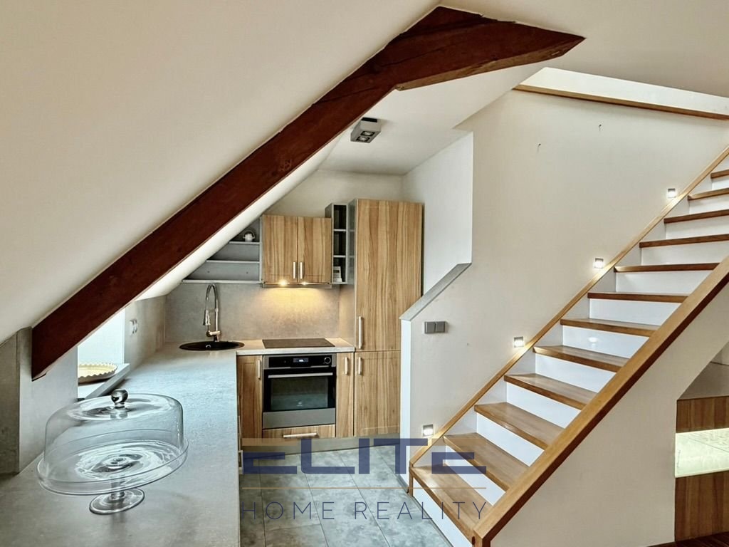 Dispozičně byt sestává ze vstupní chodby s vestavěnými skříněmi, prostorného obývacího pokoje s kuchyňským koutem a velkorysé koupelny s rohovou vanou a WC. Dominantou interiéru jsou masivní dubové schody, které vedou do mezonetové části bytu.