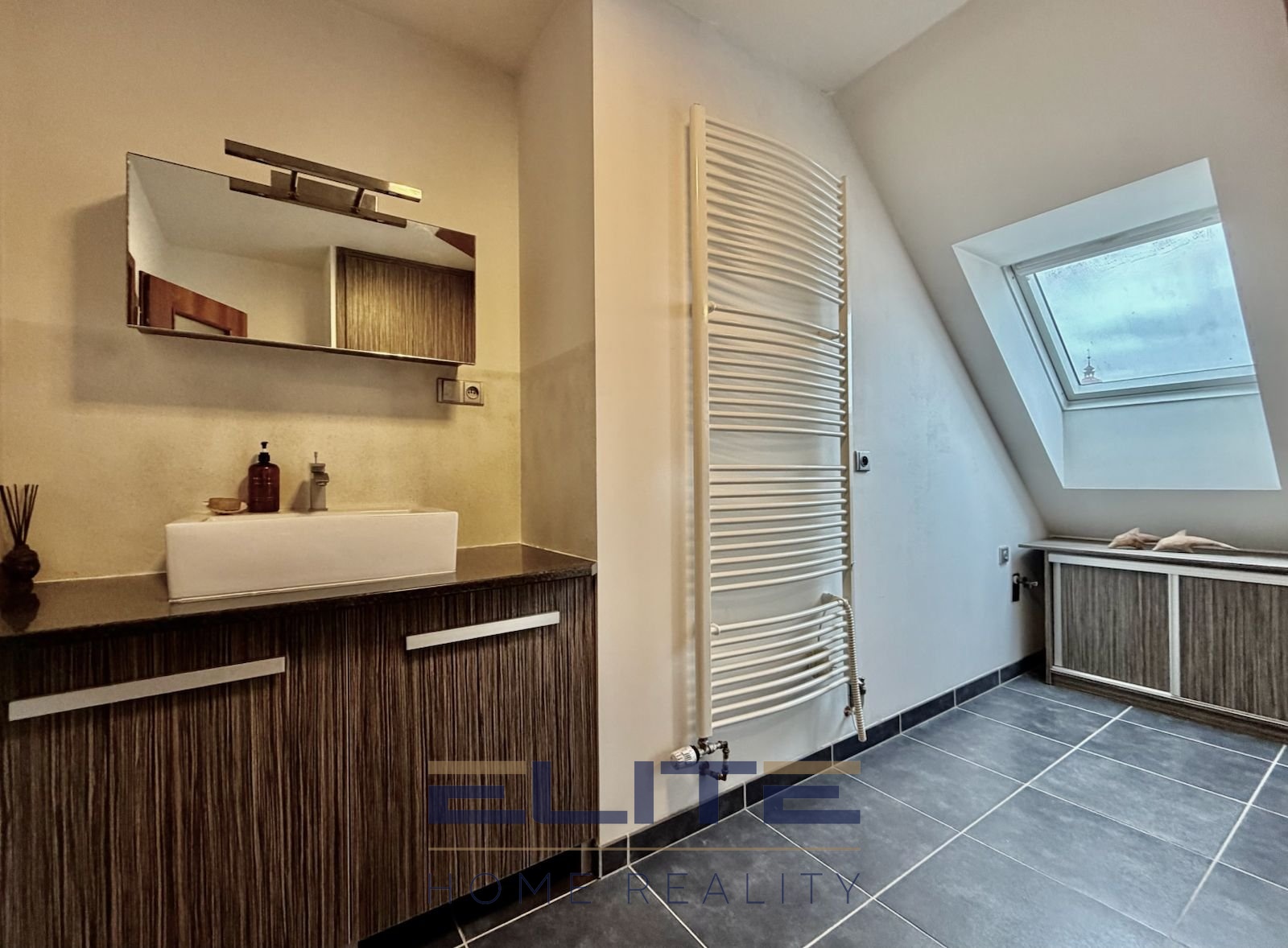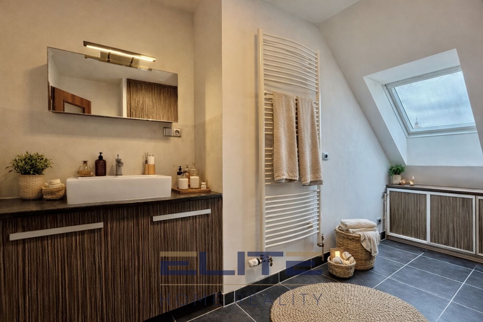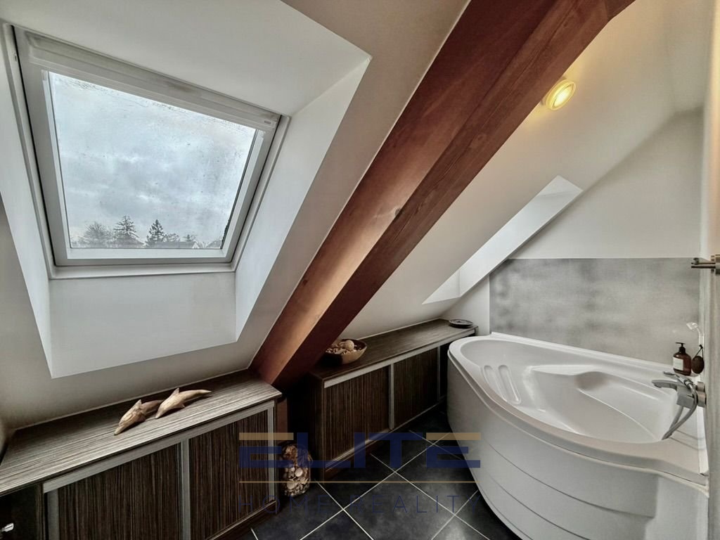 V obytných místnostech jsou plovoucí podlahy, v celém bytě dřevěné obložkové dveře, samozřejmostí jsou bezpečnostní vstupní dveře. Koupelna je vybavena WC systémem Geberit a vkusným nábytkem na míru, ve kterém je umístěn/skryt plynový kotel Viessmann, zajišťující vytápění i ohřev teplé vody. Všechna okna jsou značky Velux, která zajišťují dostatek denního světla. V koupelně prakticky plastová, v obytných částech dřevěná.