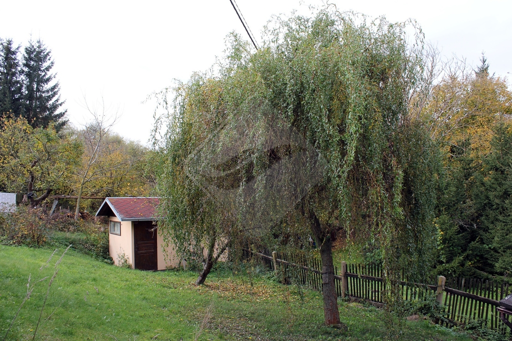 Pozemek je pravidelný, svažující se na SZ s ovocnými stromy. Na pozemku je zděný domek - kůlna.