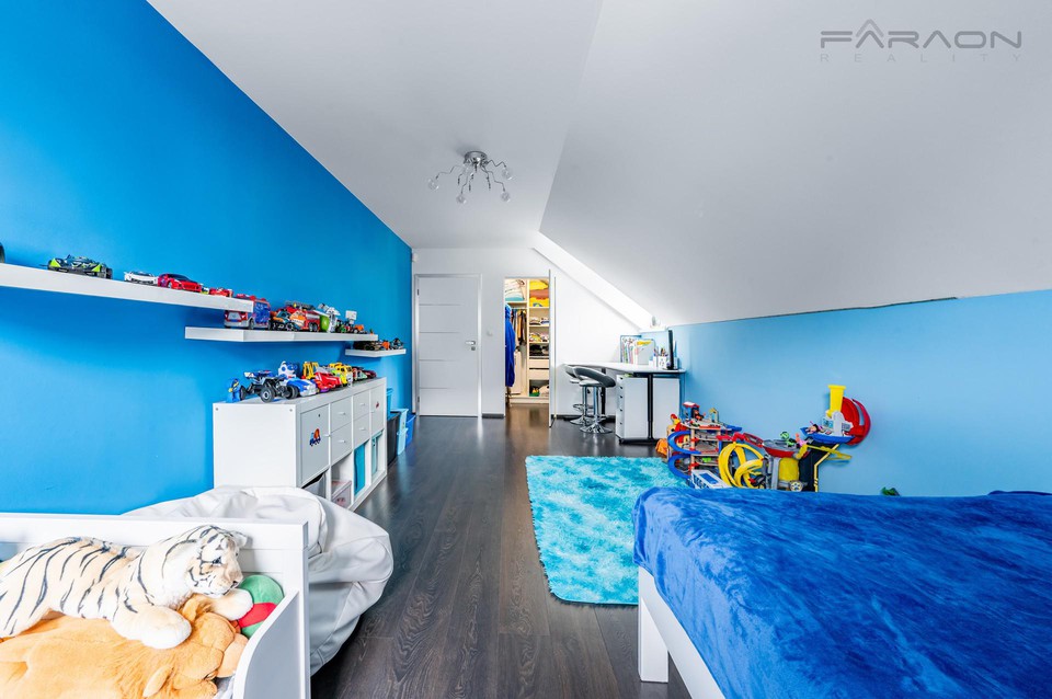 Vytápění domu zajišťuje zcela nové moderní tepelné čerpadlo a plynový kotel s podlahovým vytápěním v přízemí. Okna jsou plastová s hliníkovými rámy a elektrickými žaluziemi. V domě jsou tři prostorné vestavěné šatny a dvě koupelny vybavené luxusními prvky, včetně sauny, hydromasážní vany a vyhřívací lavice ve sprše. Exteriér doplňuje vyhřívaný a zastřešený bazén o rozměrech 6x3 metry a dětský domek o velikosti cca 25 m². Dům je připojený na městský vodovod, kanalizaci.