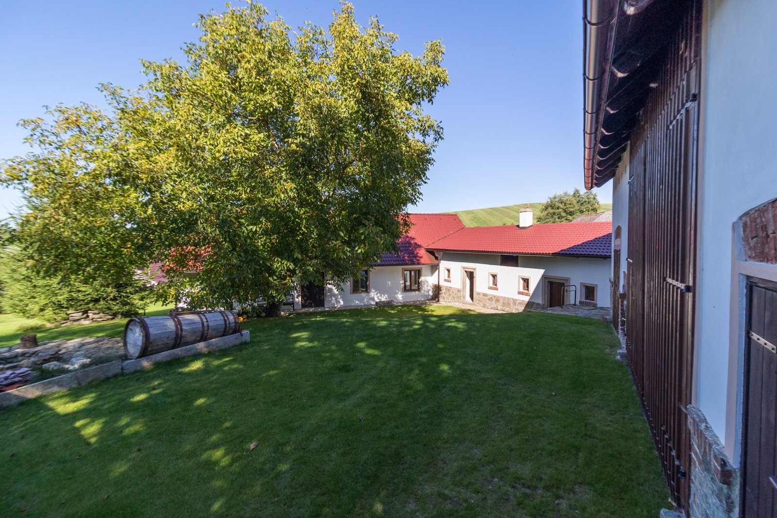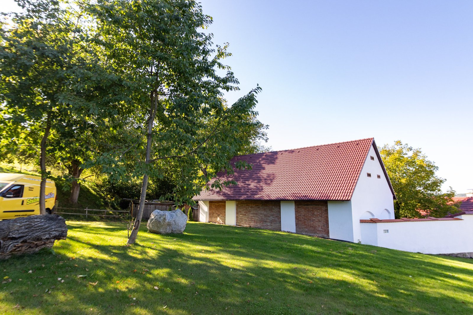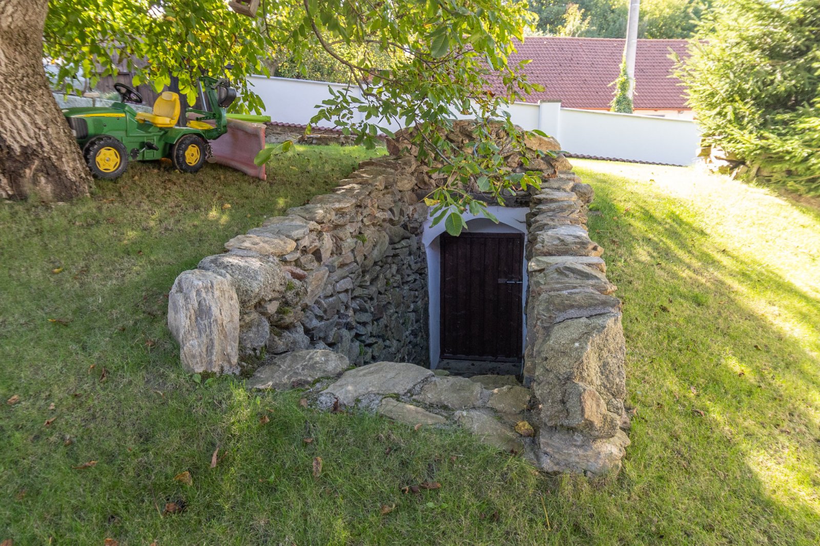 Dispoziční řešení: 4+1 o zast. ploše domu cca 180 m2, s celkovou obytnou pl. cca 100m2, o celkové ploše pozemku 1.155m2. Vnitřní dispozice: vstupní předsíň s chodbou a funkční udírnou, kuchyně s funkční pecí, el. sporákem s vestavěnými spotřebiči v nové kuchyňské lince, prostorný obývací pokoj + další tři pokoje; koupelna se sprchovým koutem, topným žebříkem, WC. Na dům navazují dva prostory s klenbovými stropy a komínem, vhodné k vytvoření příjemného společenského posezení, či vinárny. Prostory lze sloučit. Dřevěné masivní posezení je k dispozici. Součástí nemovitosti je velmi prostorná stodola (140 m2) s vlastním sklepem. Do stodoly je přívedena voda a odpady, na podlaze je leštěný beton. Dále pak nádherný zemní sklípek (10m2). Pozemek je obestavěn zdí v kombinaci osázenými stromky, které zajišťují naprosté soukromí nemovitosti se sluncem po celý den.