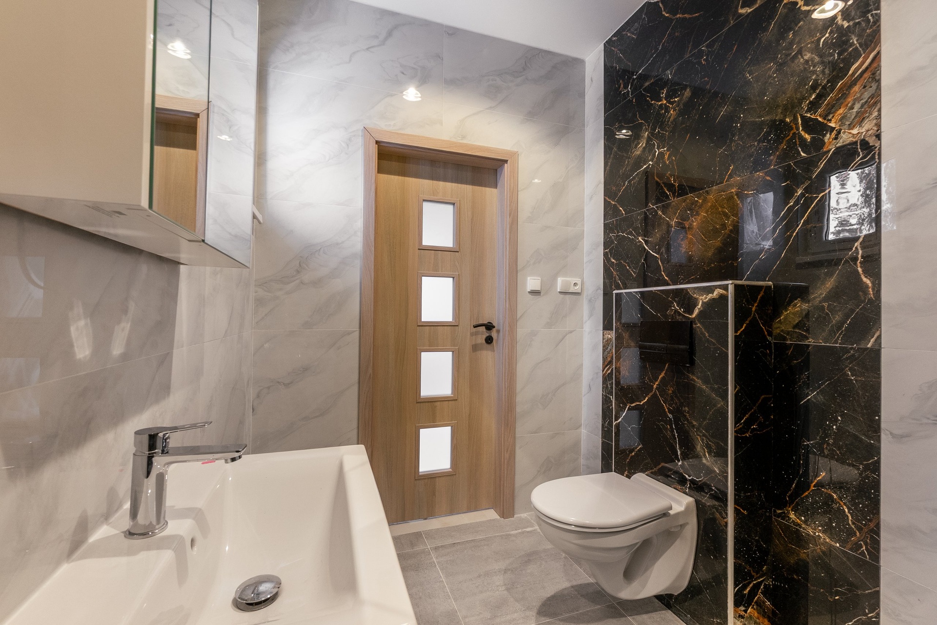 Dvě koupelny s moderními sprchovými kouty nabízí komfort, přičemž jedna z nich je situována přímo u ložnice, což zajišťuje maximální soukromí a pohodlí.