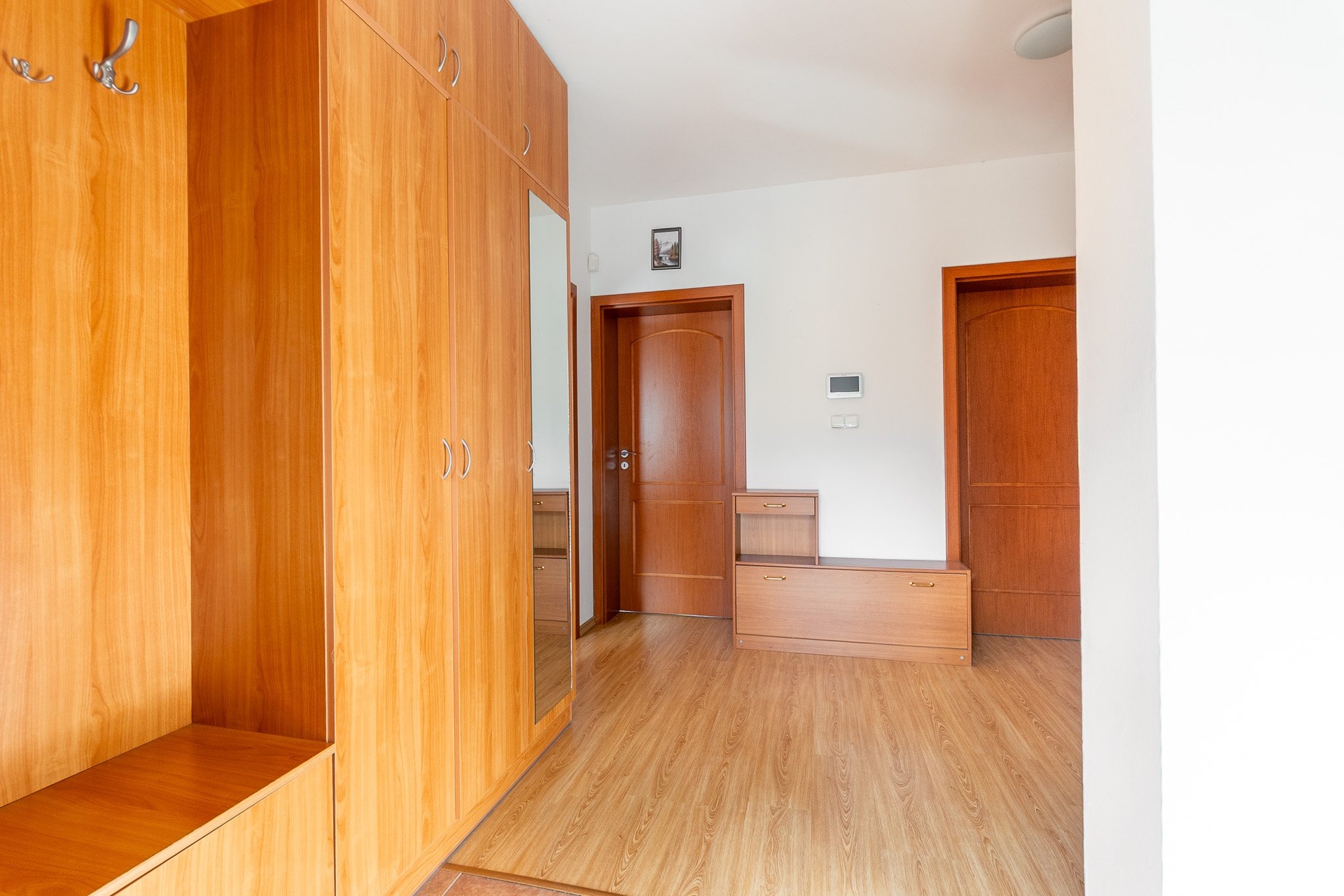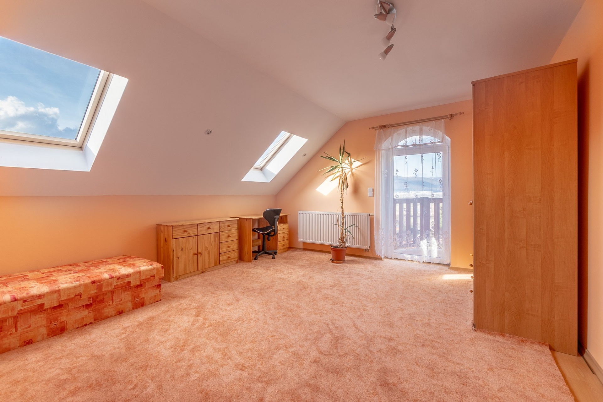 V patře se nachází dva útulné pokoje, koupelna s vanou a pracovna, ze které je vstup na balkon s výhledem na zahradu a do krajiny, kde můžete pozorovat srnky a další zázraky přírody. Také nabízí ideální prostor pro práci z domova nebo klidné zázemí pro studium.