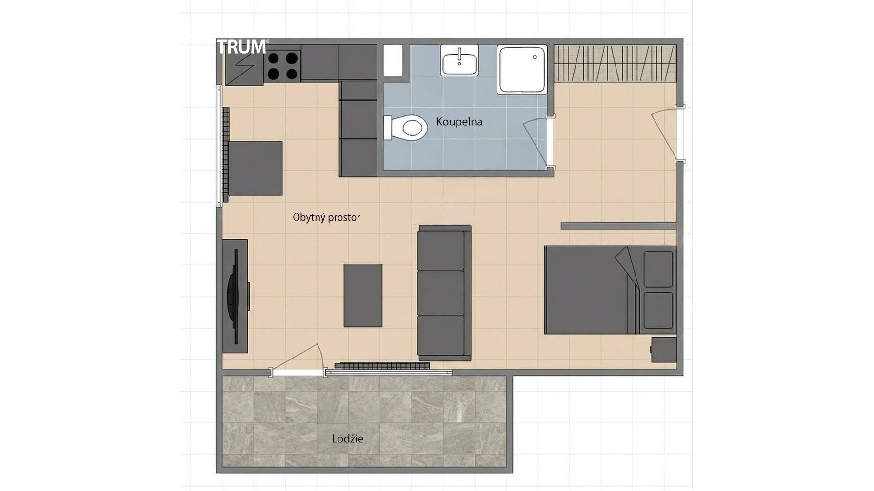 Dominantou bytu je světlá obytná místnost s kuchyňským koutem (kuchyňská linka, horkovzdušná trouba, indukční deska, mikrovlnná trouba) a praktickou spací nikou. Z pokoje je přímý vstup na prostornou lodžii s příjemným výhledem do zeleně směrem k lesu – ideální místo pro relaxaci.
