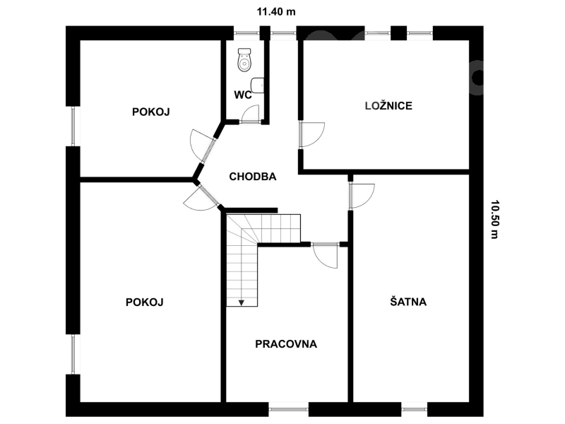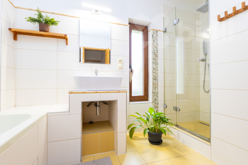 Dále je zde koupelna s vanou a sprchovým koutem, vybavená podlahovým vytápěním, a dvě samostatná WC.