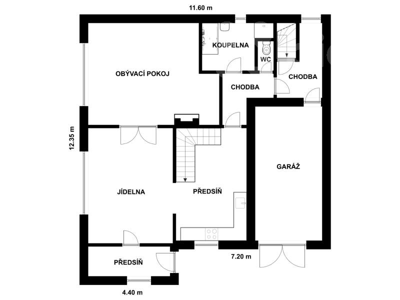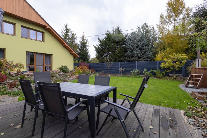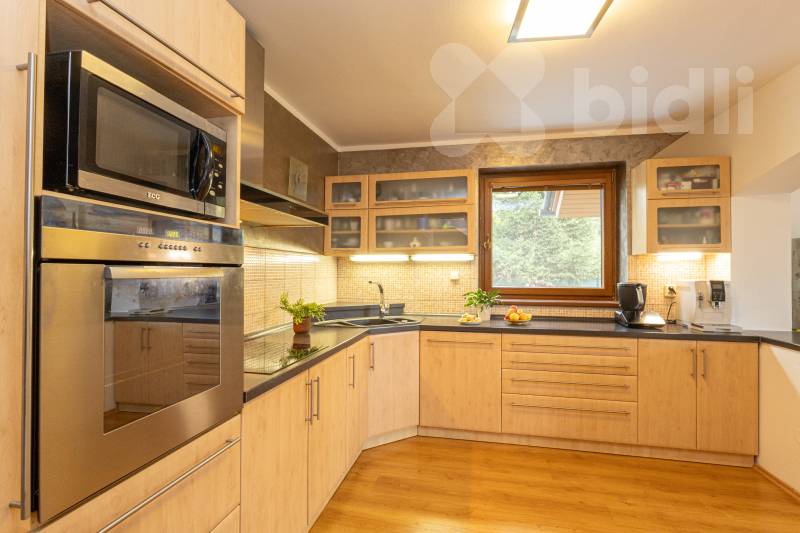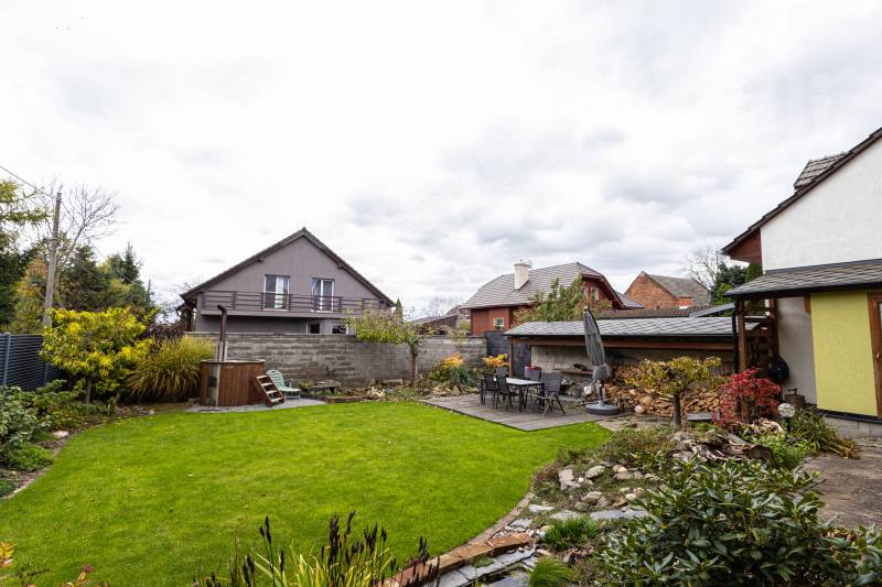 V přízemí se nachází moderní kuchyňská linka, propojená s jídelnou a prostorný obývací pokoj s krbem, který zajišťuje útulnou atmosféru i efektivní vytápění domu.