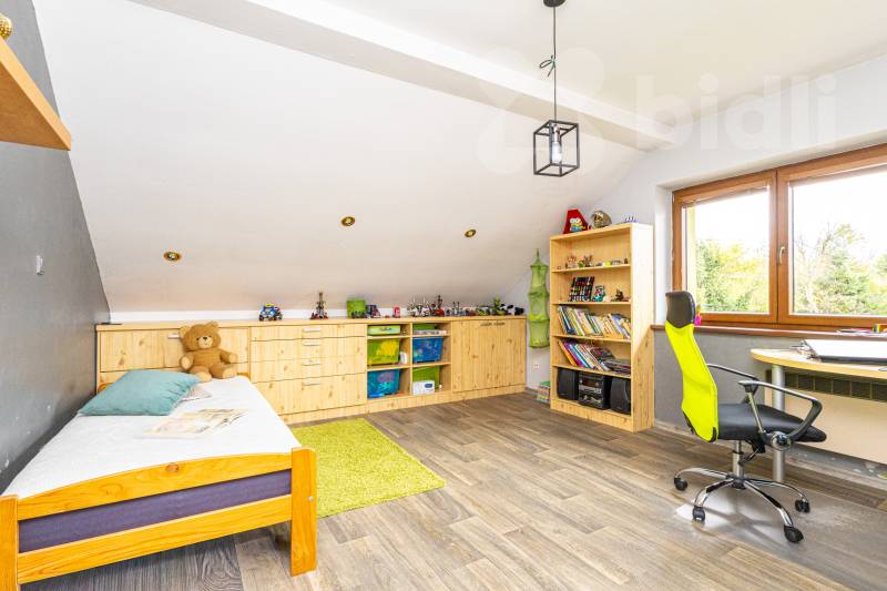 V patře jsou originálně řešené pokoje se šikminami, které nabízejí dostatek prostoru i soukromí. Dům je částečně podsklepený. Na pozemku se nachází přístavek na dřevo a zahradní náčiní, udržovaná zahrada s příjemným posezením a dostatek prostoru pro relaxaci i rodinné aktivity. Vše oploceno. Je zde i garáž. Tento dům představuje kombinaci moderního, úsporného a komfortního bydlení v klidné lokalitě s výbornou dostupností do centra města. Ideální volba pro ty, kteří hledají kvalitní a úsporné rodinné bydlení v Mohelnici.