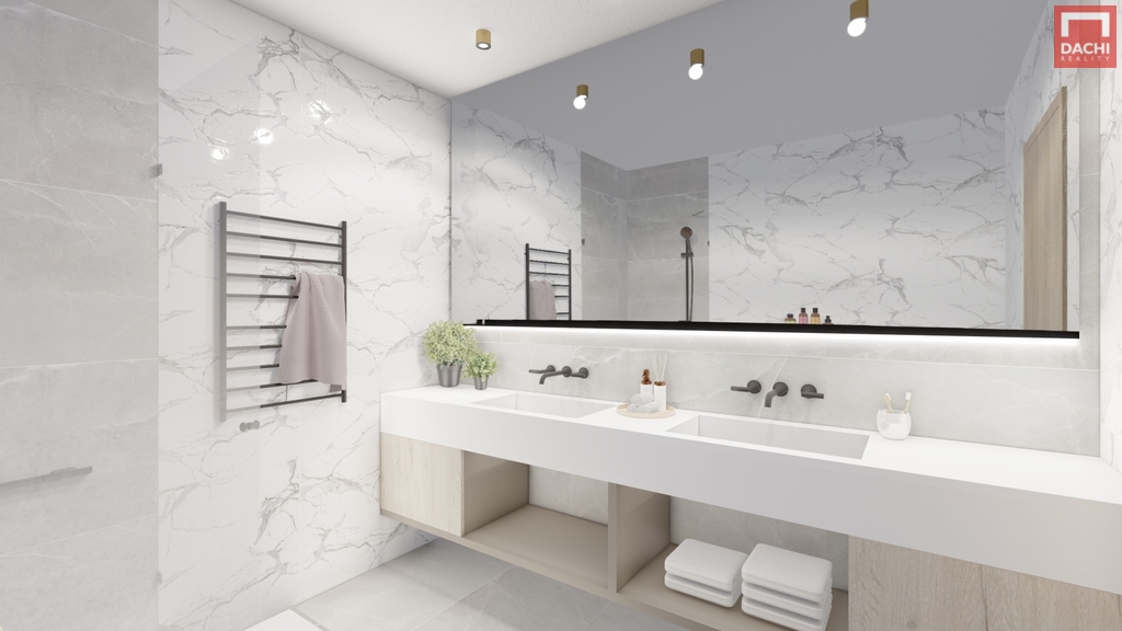 Součástí standardního vybavení jsou venkovní žaluzie, úsporné tepelné čerpadlo vzduch–voda, upravená zahrada i okolí před domem, příprava na instalaci solární elektrárny, prostorná garáž i venkovní parkovací stání. Dům je připraven k dokončení tak, aby si budoucí majitel mohl vybrat z více barevných variant podlah a obkladů podle svého vkusu. Standardní provedení je již zahrnuto v ceně a vyznačuje se vysokou kvalitou použitých materiálů i zařizovacích prvků, takže nový domov bude nejen funkční, ale i nadčasově elegantní.
