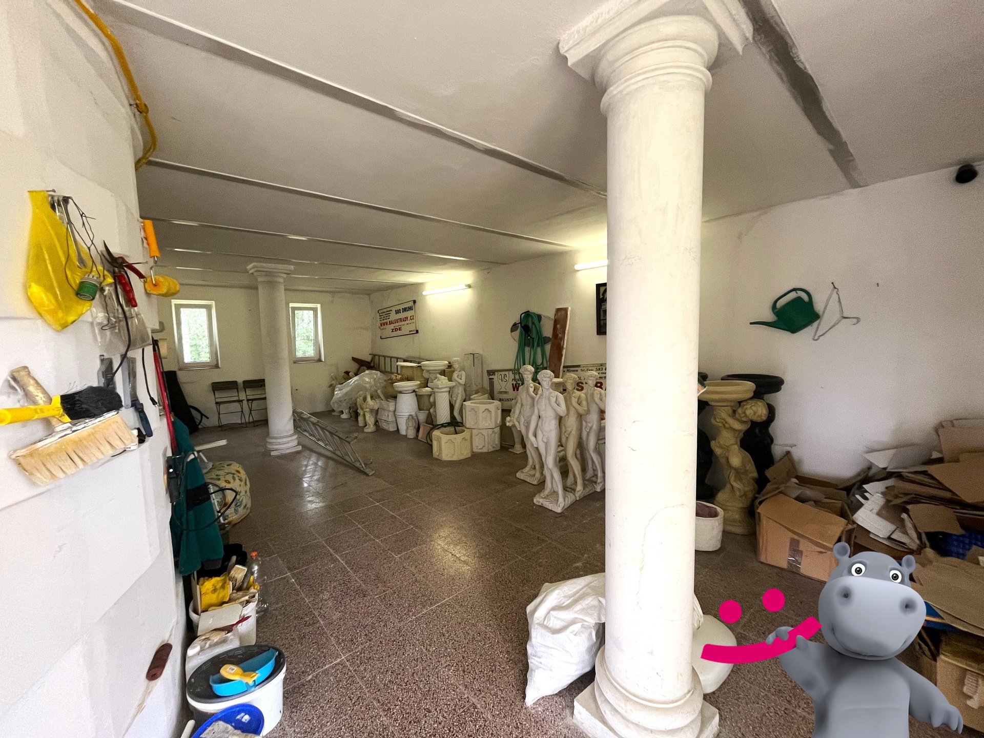 V přízemní části budovy (cca 135m2) je otevřená místnost využívaná jako prodejna, kancelář a jednací místnost.