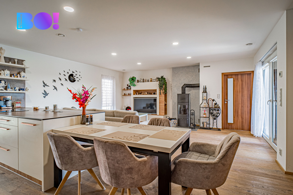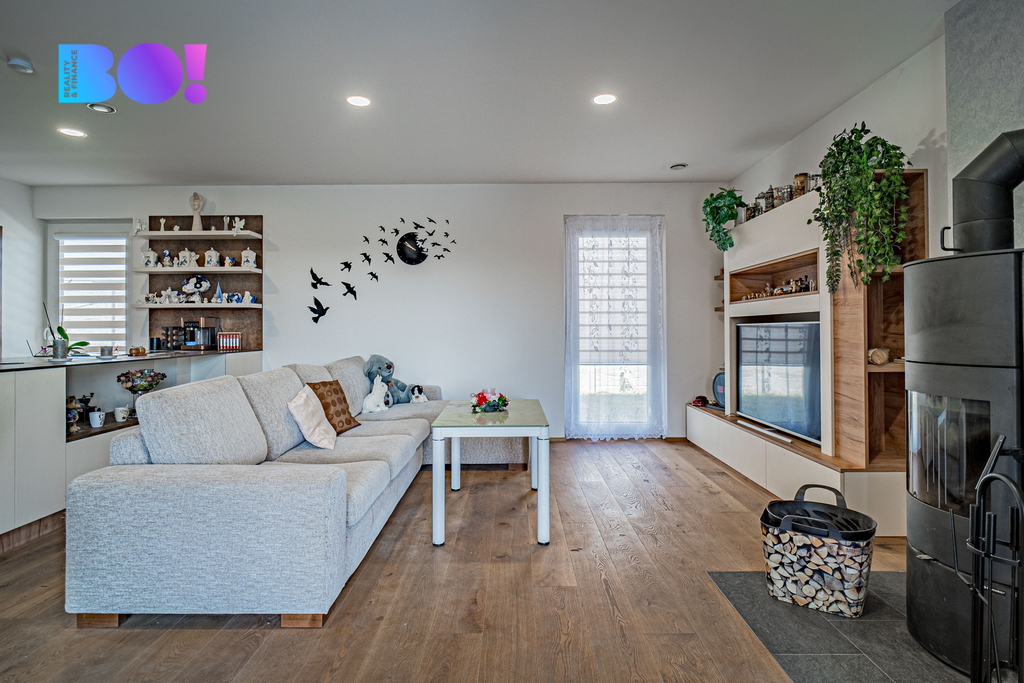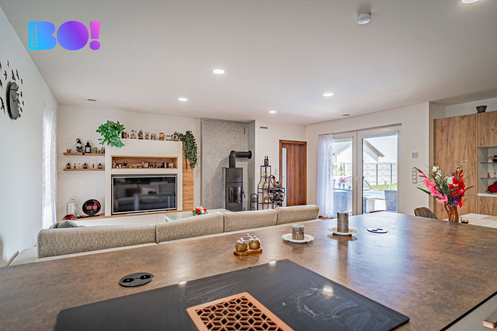 Dominantou domu je velkorysý obývací prostor s kuchyní, který tvoří přirozené srdce celého domu. Kuchyň je vybavena novou moderní kuchyňskou linkou se spotřebiči a nabízí dostatek prostoru pro vaření i společné chvíle s rodinou či přáteli.