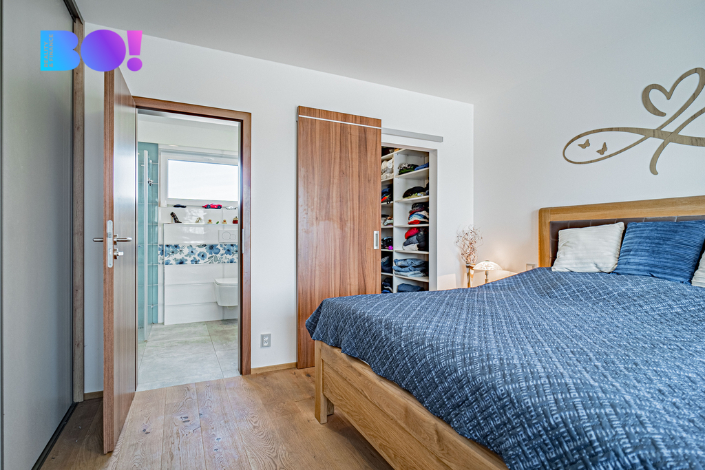 V interiéru najdete kvalitní dřevěné podlahy, které podtrhují elegantní charakter celého domu. Praktickou výhodou jsou také vestavěné skříně v pokojích i obývacím prostoru, které zajišťují dostatek úložného prostoru a zároveň zachovávají čistý a moderní vzhled interiéru.