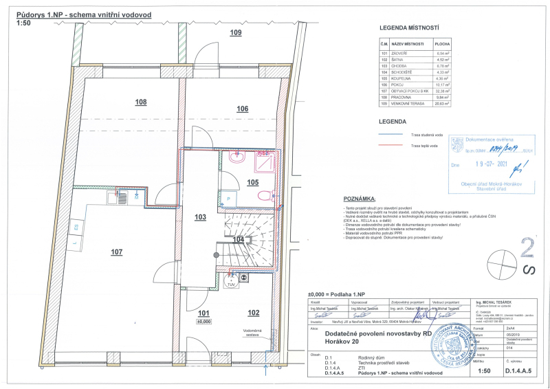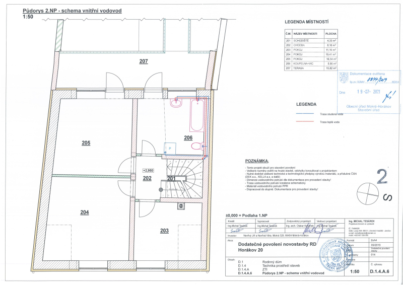 Zádveří - 3.72 m2; Šatna - 6.12 m2, Chodba - 9.01 m2, Schodiště - 3.28 m2, Koupelna - 4.29 m2, Pokoj - 10.12 m2, Obývací pokoj s KK - 25.37 m2, Pracovna - 10.12 m2