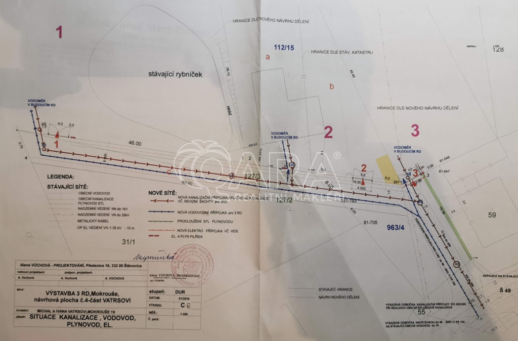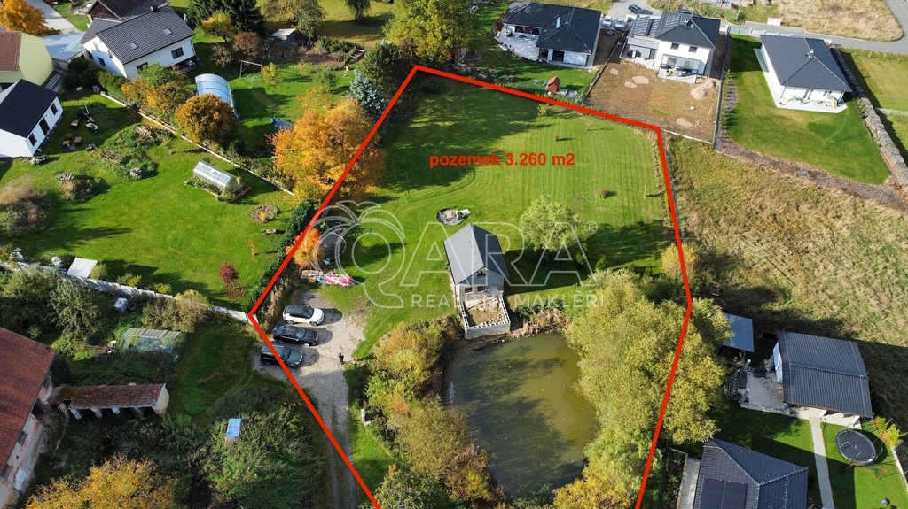 V územním plánu je pozemek vedený jako plocha smíšená obytná venkovská - plocha stabilizovaná, z inženýrských sítí je zaveden veřejný vodovodní řád, elektřina a veřejná kanalizace, připojení na plyn v příjezdové asfaltové komunikaci, která zajištuje přístup na pozemek. Součástí pozemku je také přírodní jezírko o rozloze 310 m², které přispívá k příjemnému prostředí a možnostem pro rekreační využití a dále podíl na příjezdové cestě, vyznačené na obrázku. Maximální podíl zastavění: Koeficient zastavění území max. 0,4 (poměr zastavěné plochy všech nadzemních částí stavby bez zpevněných ploch k výměře pozemku). Minimální podíl zeleně: 30% (podíl ploch zeleně, jako jsou travnaté plochy, zatravněné pobytové plochy, plochy užitkových a okrasných záhonů, k celkové ploše stavebního pozemku).