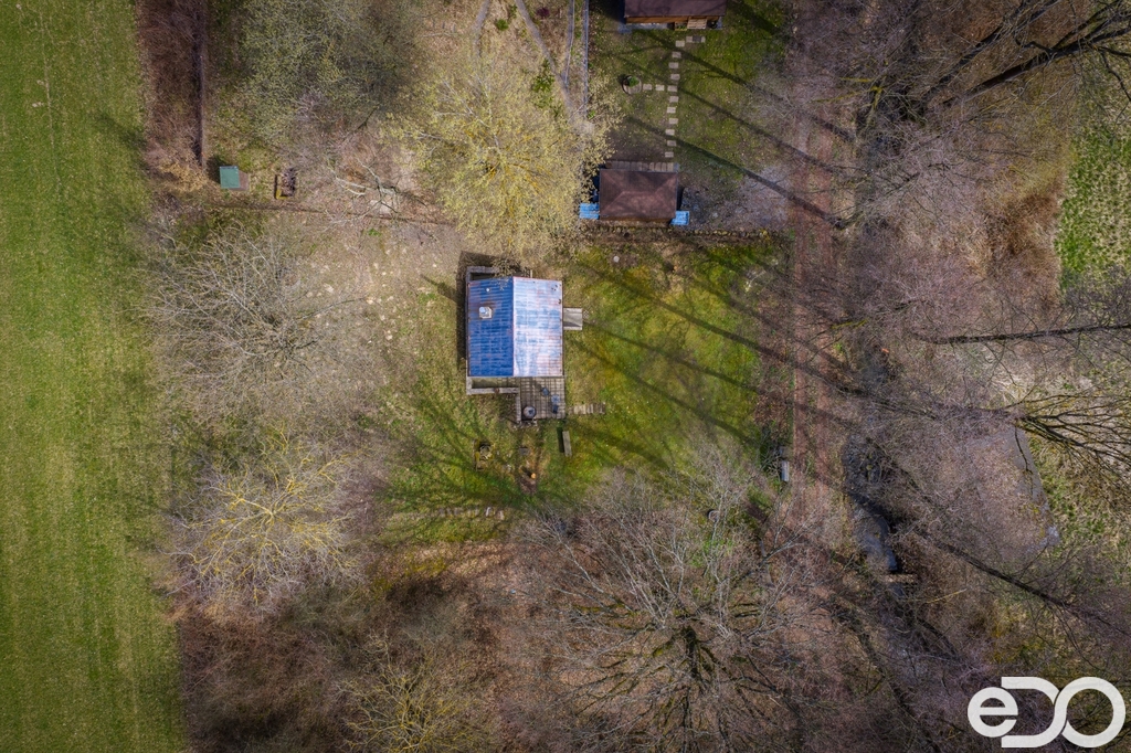 Chata je ve velmi dobrém stavu a nabízí přibližně 45 m² užitné plochy. V suterénu se nachází koupelna s vanou a umyvadlem a vedlejší praktická místnost sloužící jako úložný prostor. Hlavní obytné podlaží tvoří kuchyň s kuchyňskou linkou, dřezem a místem pro posezení u stolu, odkud je zároveň vstup do horní části chaty i na jihovýchodně orientovaný balkon. Právě tady se ukazuje největší kouzlo celého místa – výhled do zahrady a okolní zeleně, ranní světlo, klid a atmosféra, která člověka okamžitě nutí zpomalit. V podkroví pak najdete útulný prostor pro spaní, přesně takový, jaký od rekreační chaty v podobném prostředí čekáte.