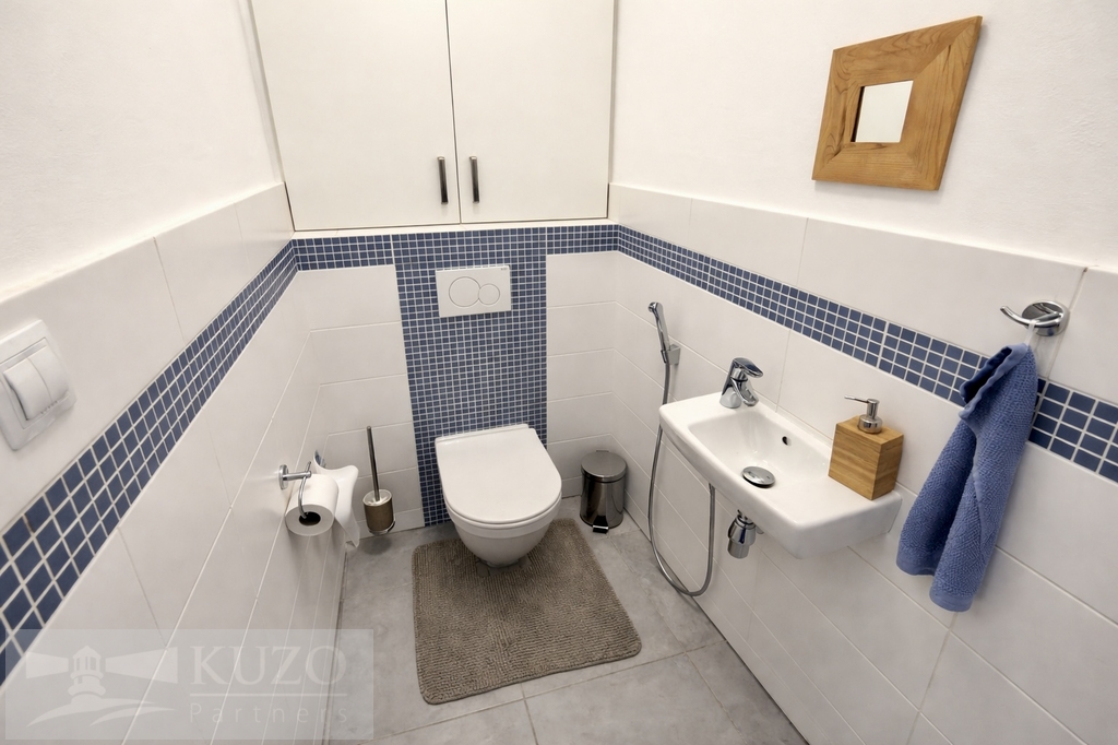 Byt se nachází v prvním podlaží, jedná se o zvýšené přízemí, a hlavní obytné místnosti jsou orientovány na východ a západ. Součástí prodeje jsou vestavěné skříně v předsíni a koupelně a kompletní kuchyňská linka včetně spotřebičů, konkrétně myčky, lednice, pračky, trouby a indukční varné desky, digestoře.