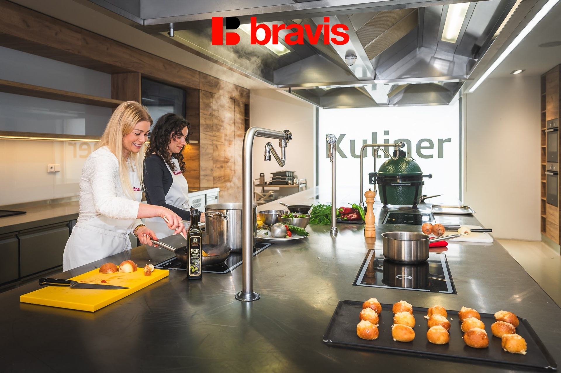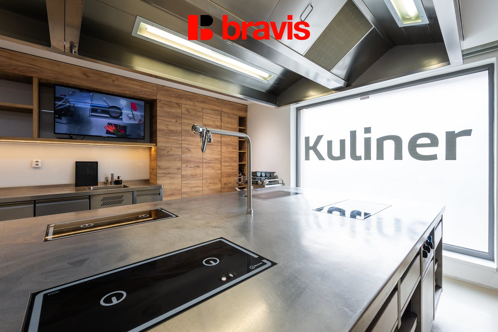 • Audiovizuální systém: Obrazovky v obou patrech pro detailní přenos práce šéfkuchaře z pracovní desky k účastníkům.