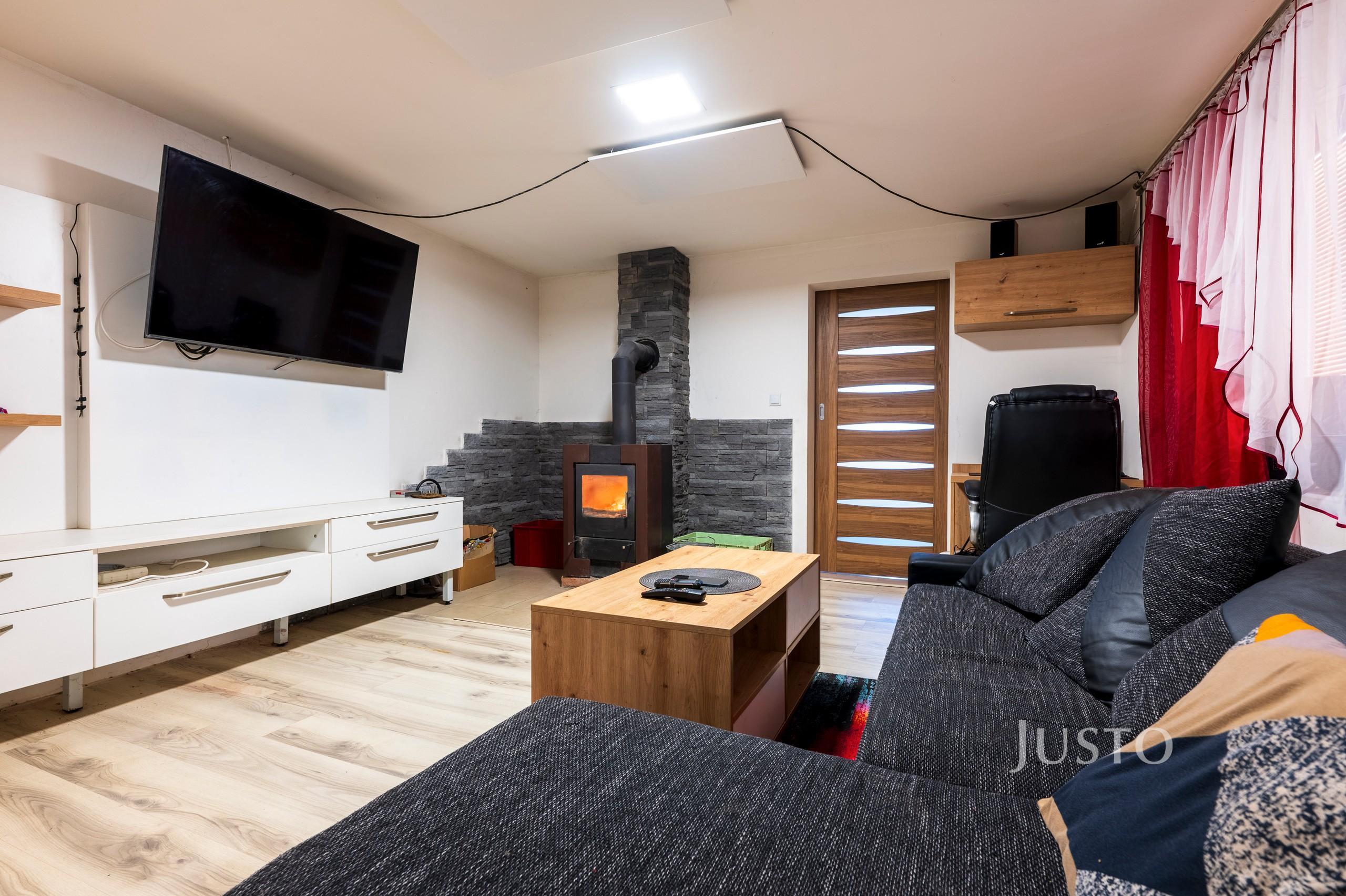 Zdroj tepla pro dům jsou krbová kamna a infrapanely na stropech všech místností.