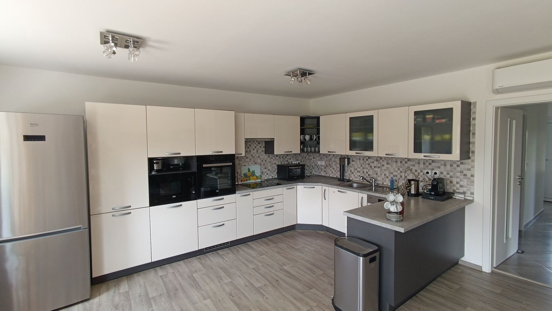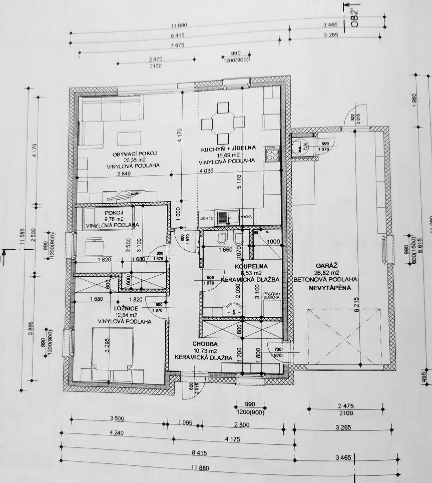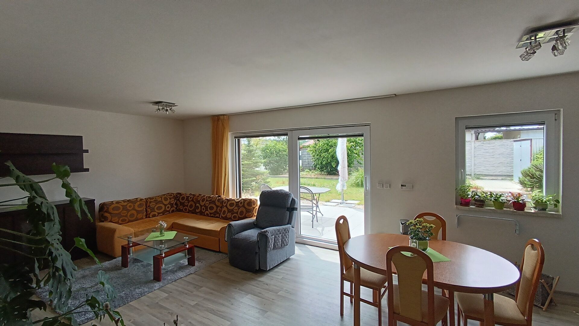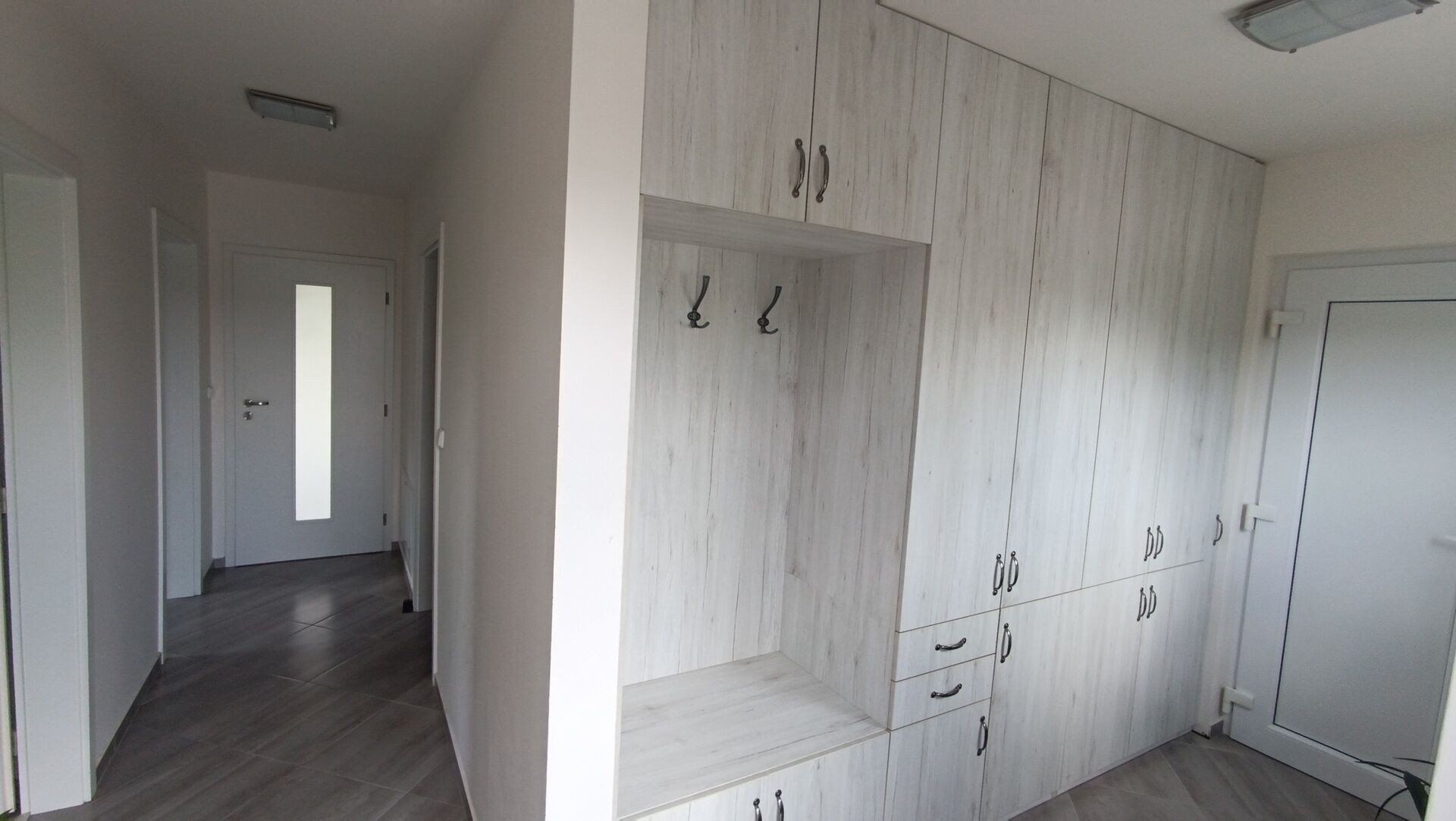 Dispozice: Vstupní chodba/zádveří s vestavnými skříněmi, obývací pokoj s kuchyňským koutem a vestavěnými spotřebiči (myčka, indukční varná deska, multifunkční trouba, mikrovlnná trouba, digestoř), ložnice s vestavnými skříněmi , pokoj s vestavnými skříněmi, koupelna s WC, garáž.