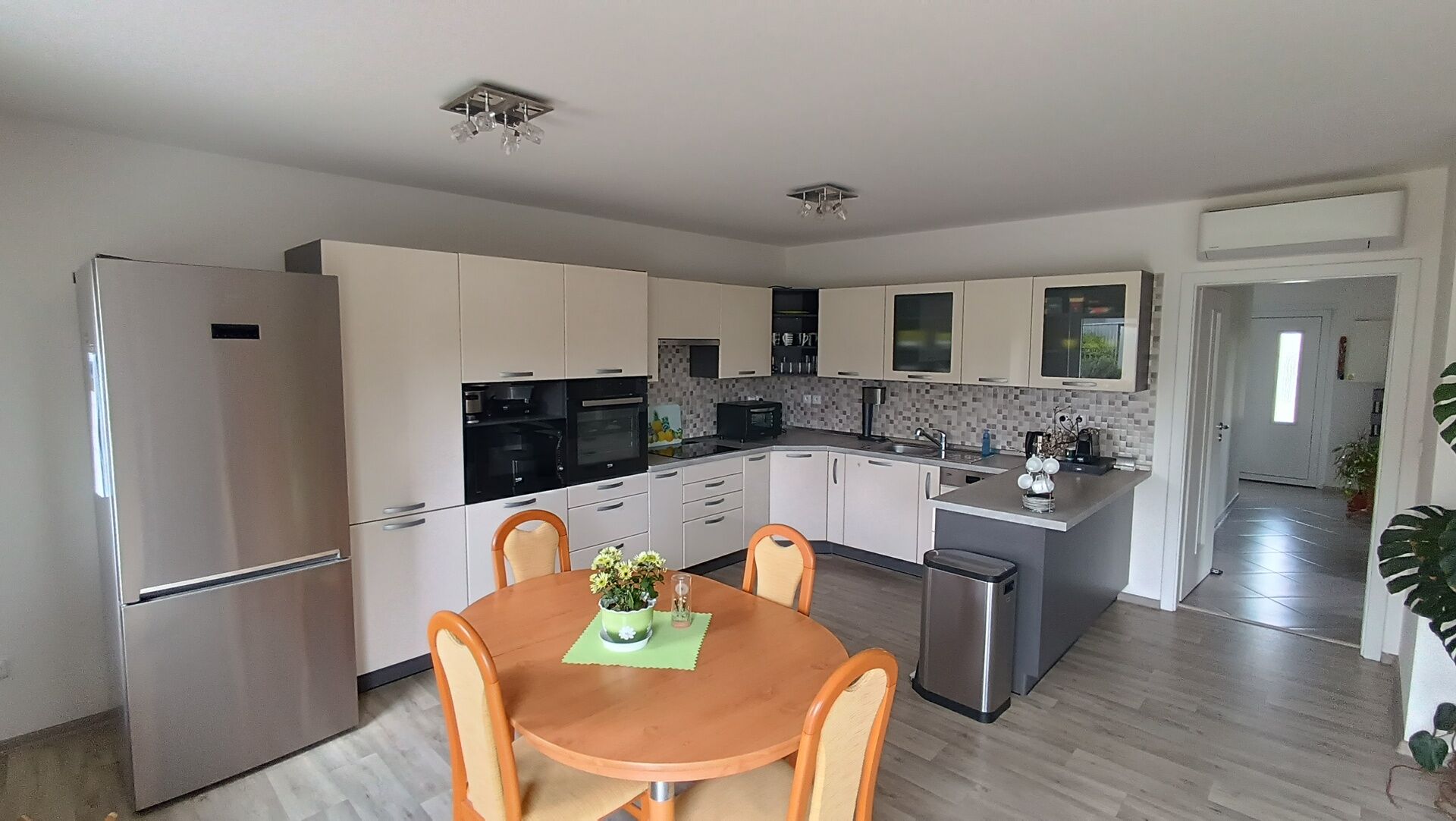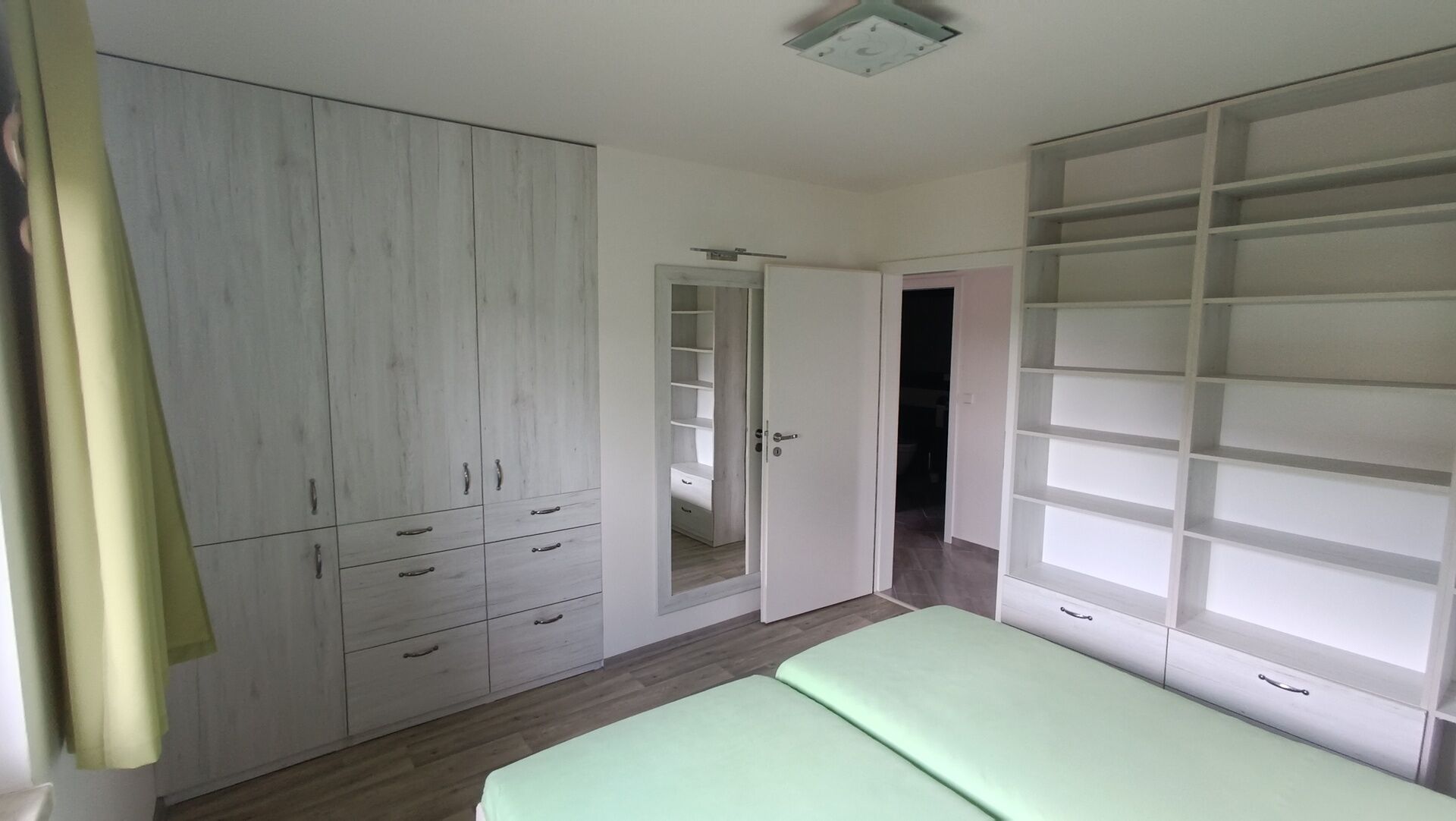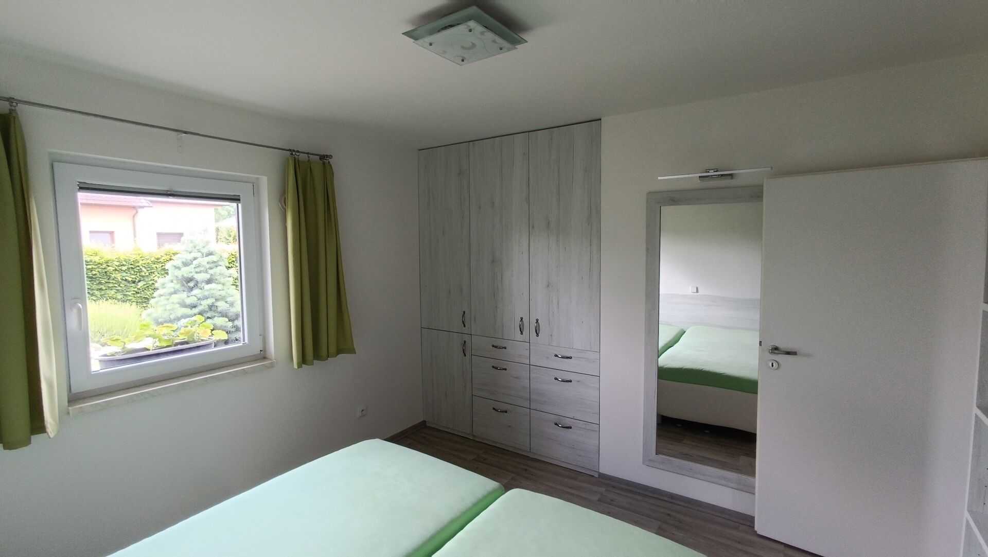 Dispozice: Vstupní chodba/zádveří s vestavnými skříněmi, obývací pokoj s kuchyňským koutem a vestavěnými spotřebiči (myčka, indukční varná deska, multifunkční trouba, mikrovlnná trouba, digestoř), ložnice s vestavnými skříněmi , pokoj s vestavnými skříněmi, koupelna s WC, garáž.