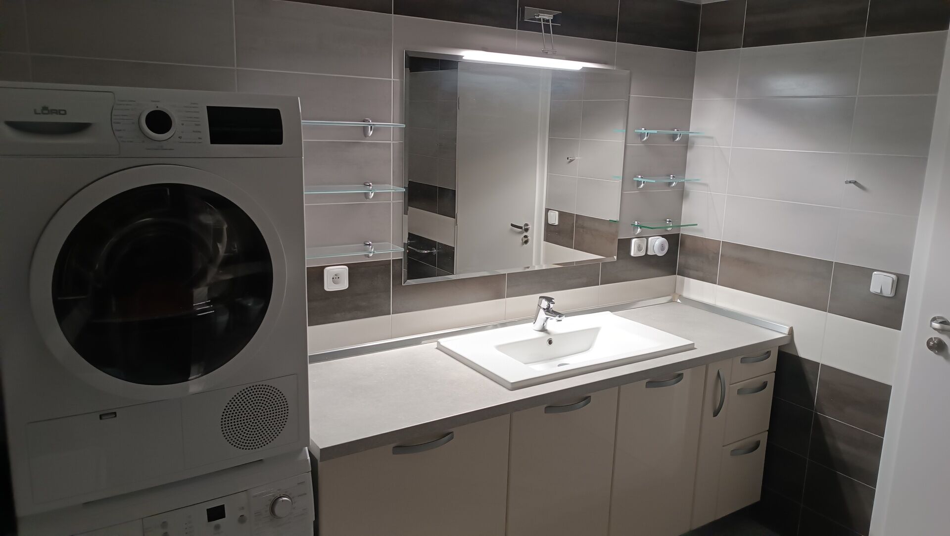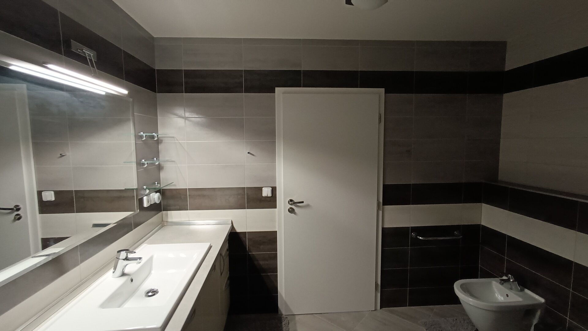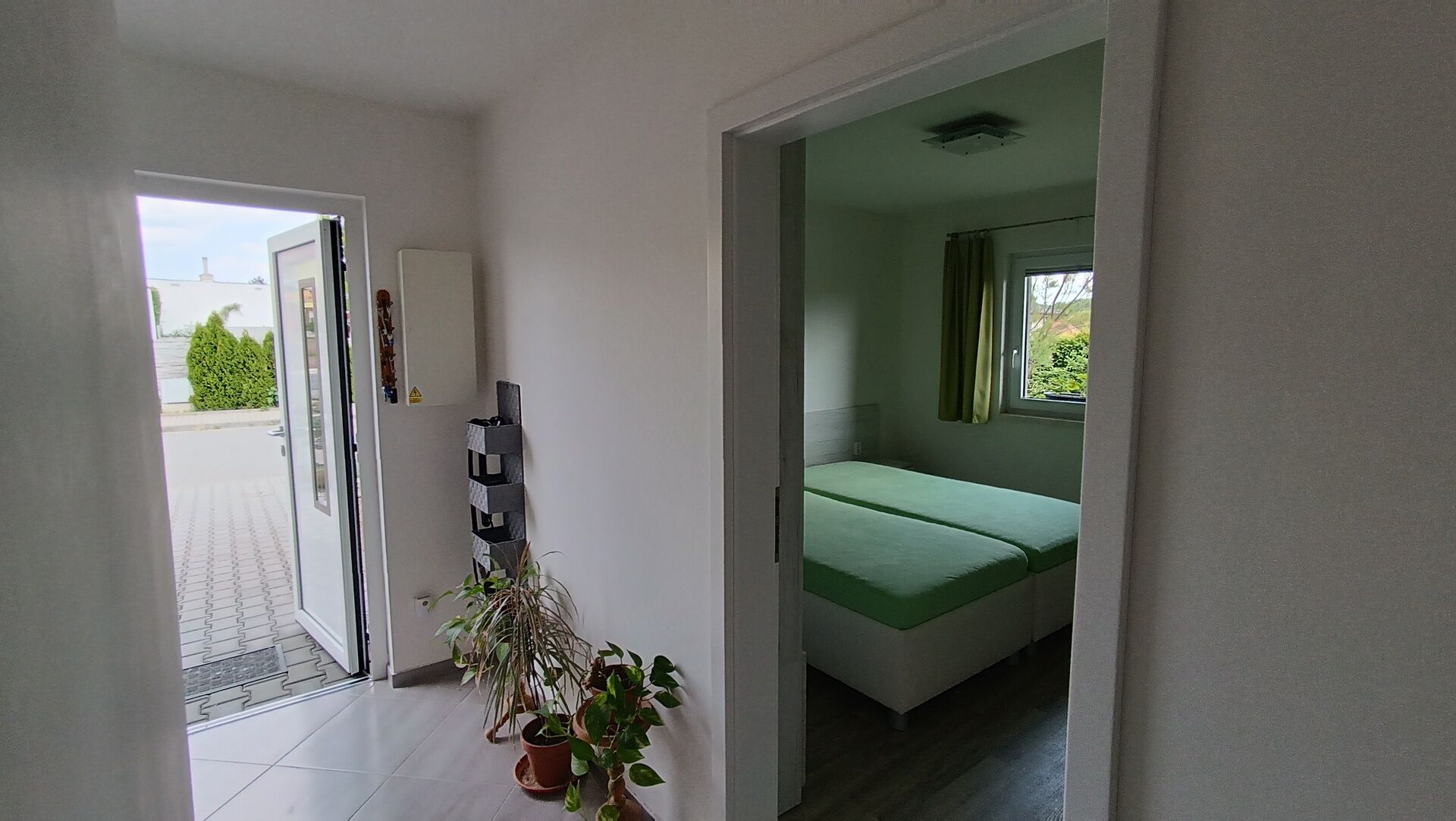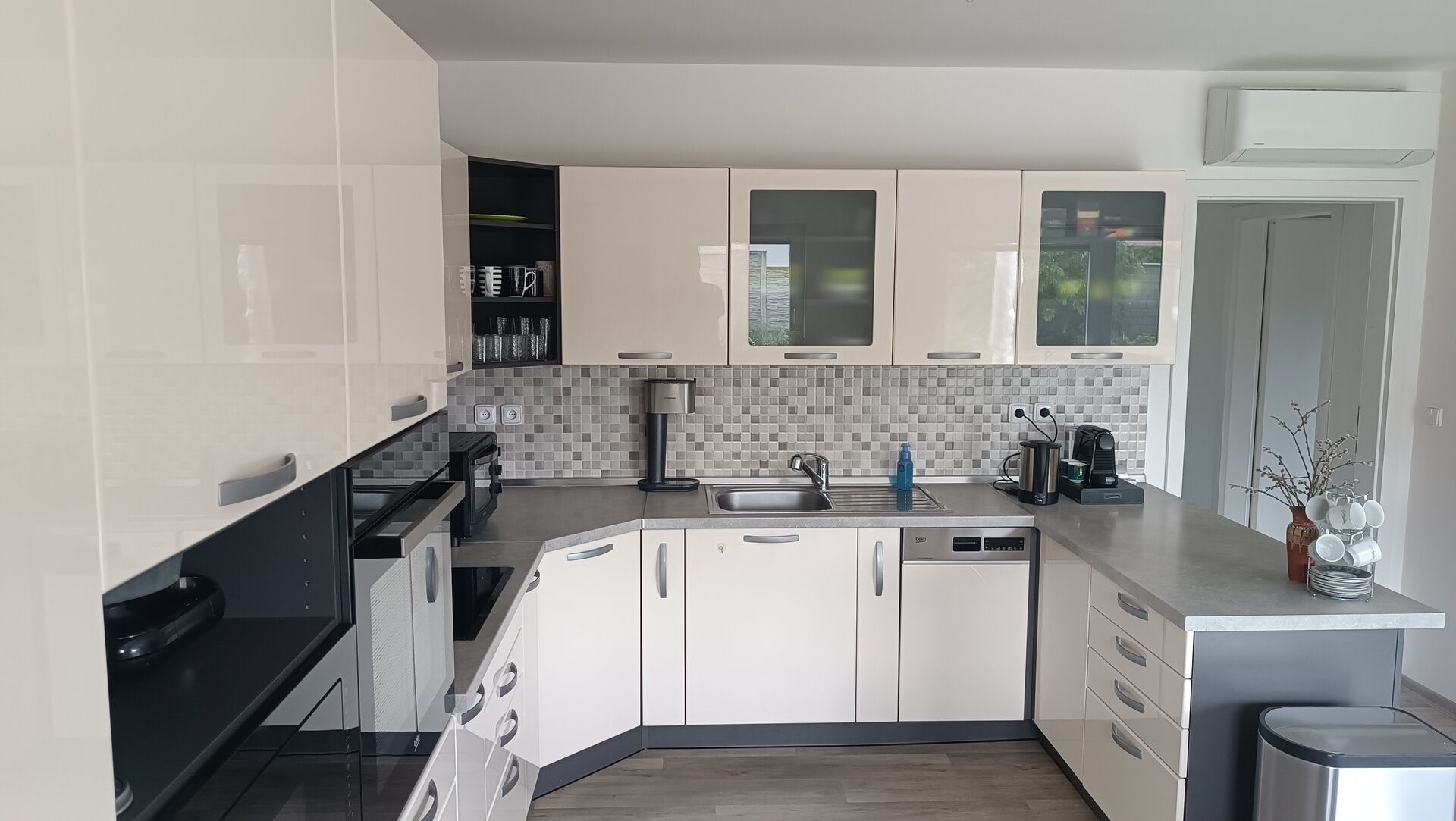 Dispozice: Vstupní chodba/zádveří s vestavnými skříněmi, obývací pokoj s kuchyňským koutem a vestavěnými spotřebiči (myčka, indukční varná deska, multifunkční trouba, mikrovlnná trouba, digestoř), ložnice s vestavnými skříněmi , pokoj s vestavnými skříněmi, koupelna s WC, garáž.