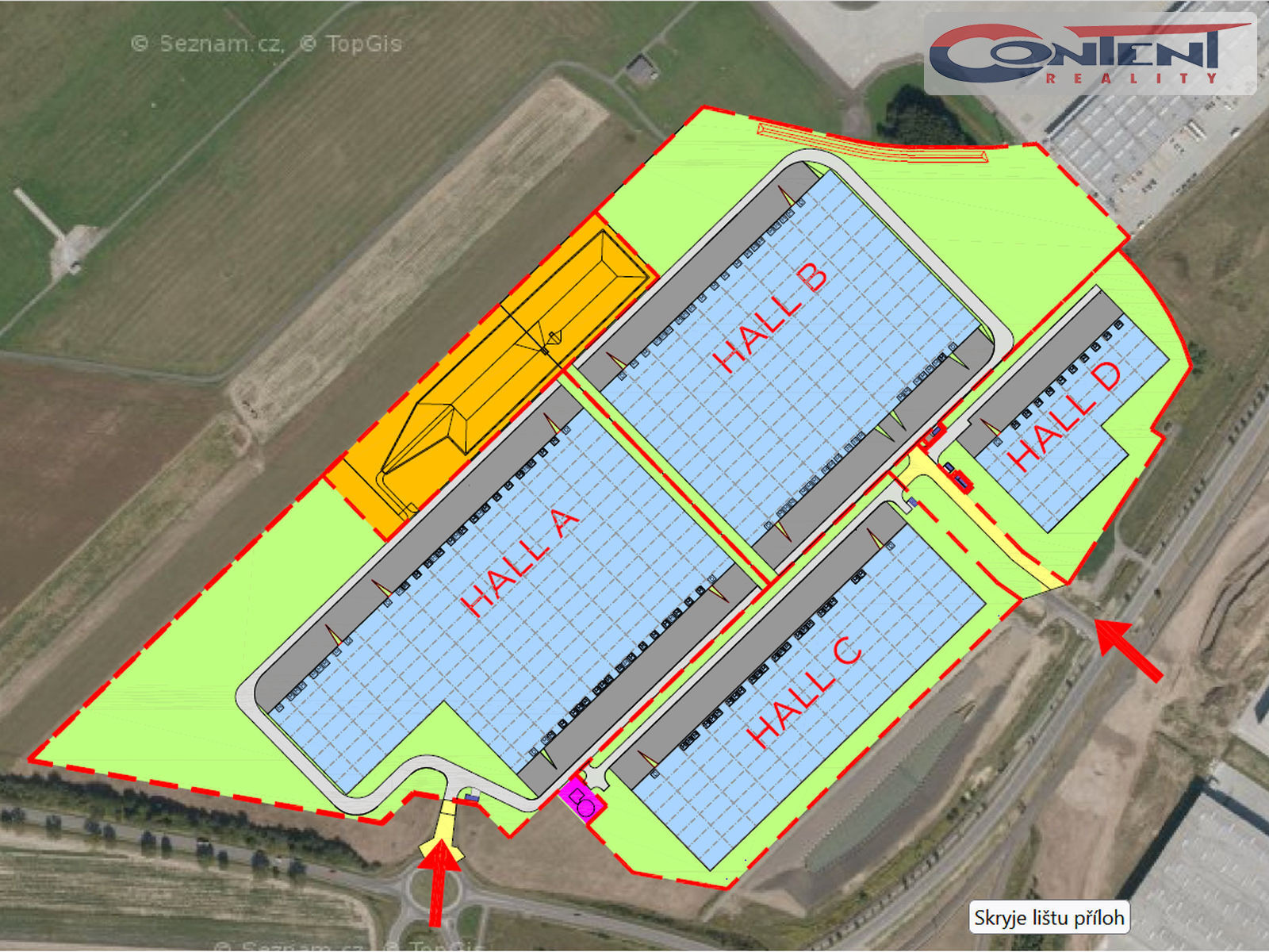 - v areálu k pronájmu prostory 3500 m² až 45923 m².