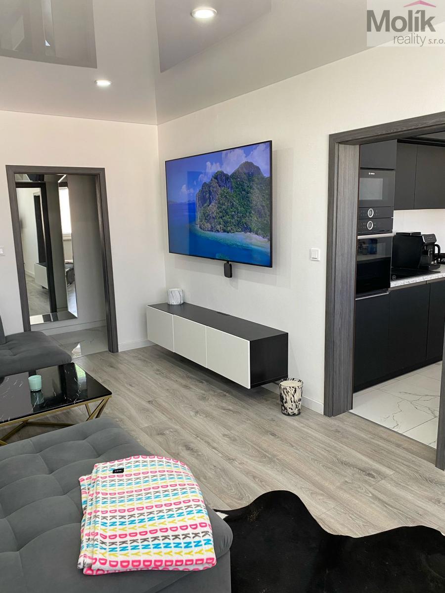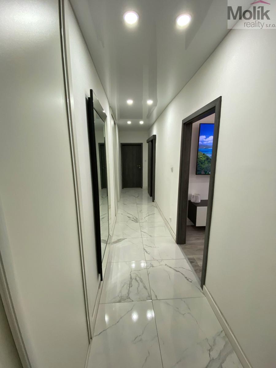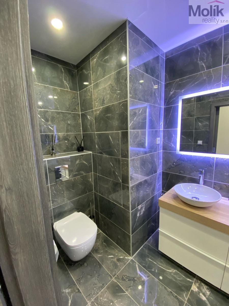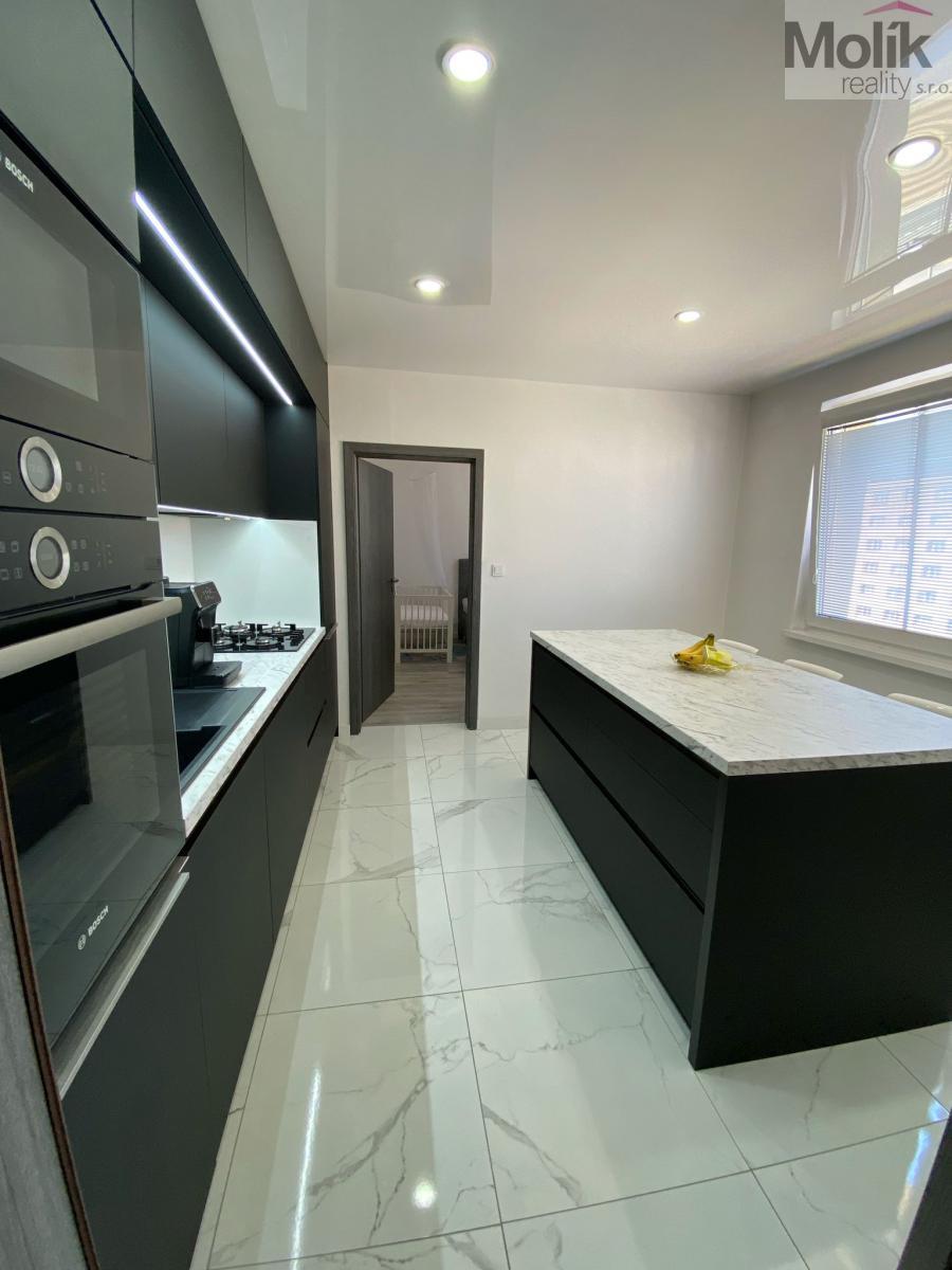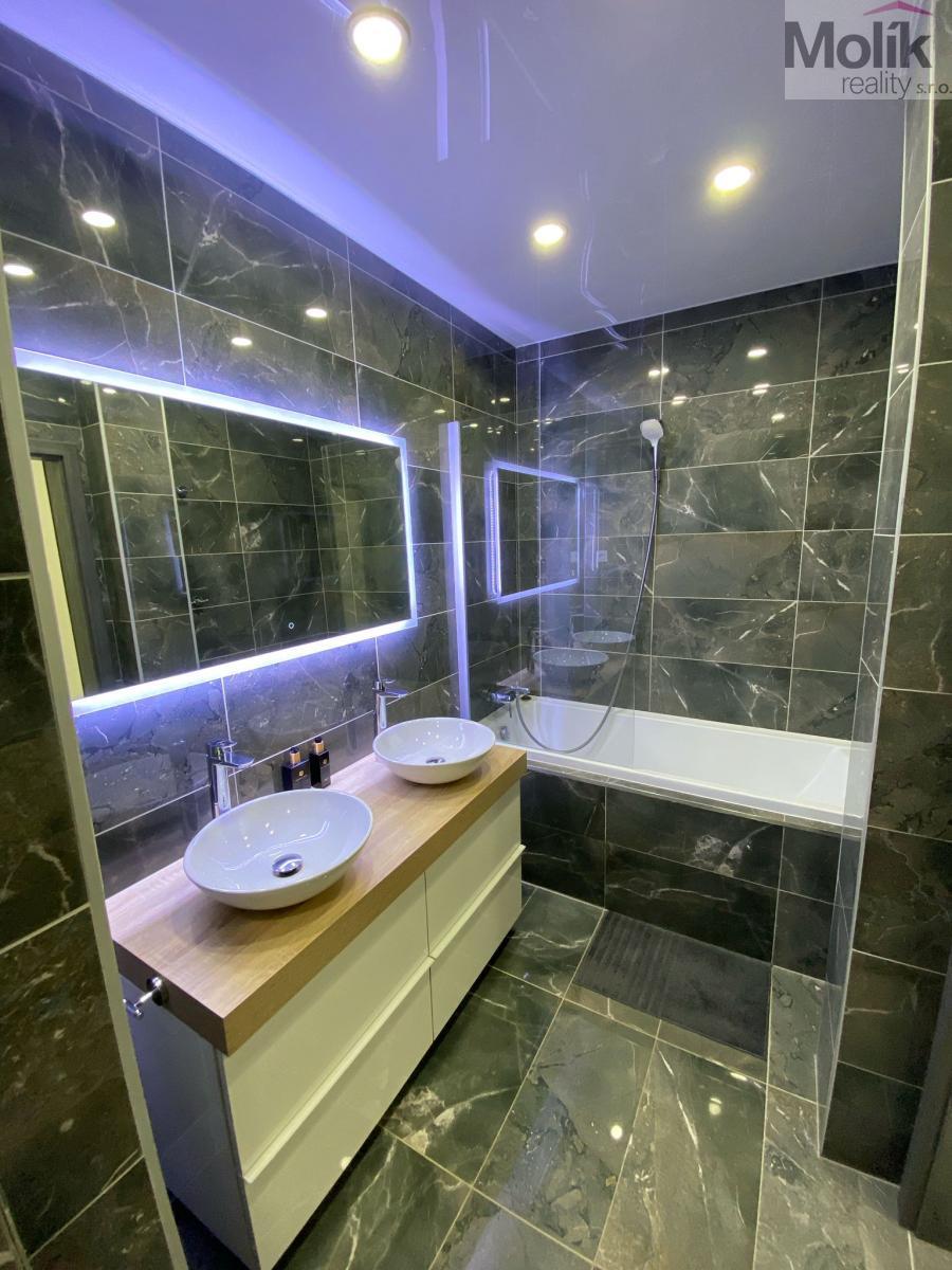 Byt je po kompletní rekonstrukci - Exkluzivní Kuchyň na míru od truhláře (nadstandartní 70cm hloubka) elektrický koš, doživotní Záruka na pojezdy Blum, myčka AEG, pračka LG, lednice, plynový sporák, vestavná trouba a mikrovlnka značky Bosch. Velkou předností je kuchyňský ostrůvek s posezením a úložný prostor. Exkluzivní koupelna nabídne keramickou dlažbu Italského výrobce, 2 umyvadla se skříňkou, zrcadlo s led podsvícením, zásuvku na fén a prostornou vanu značky Ravak se zástěnou ze skla. Wc Ideal Standard. Všechny baterie, sprcha, vestavný splachovací systém, háčky na ručníky jsou značky Grohe.