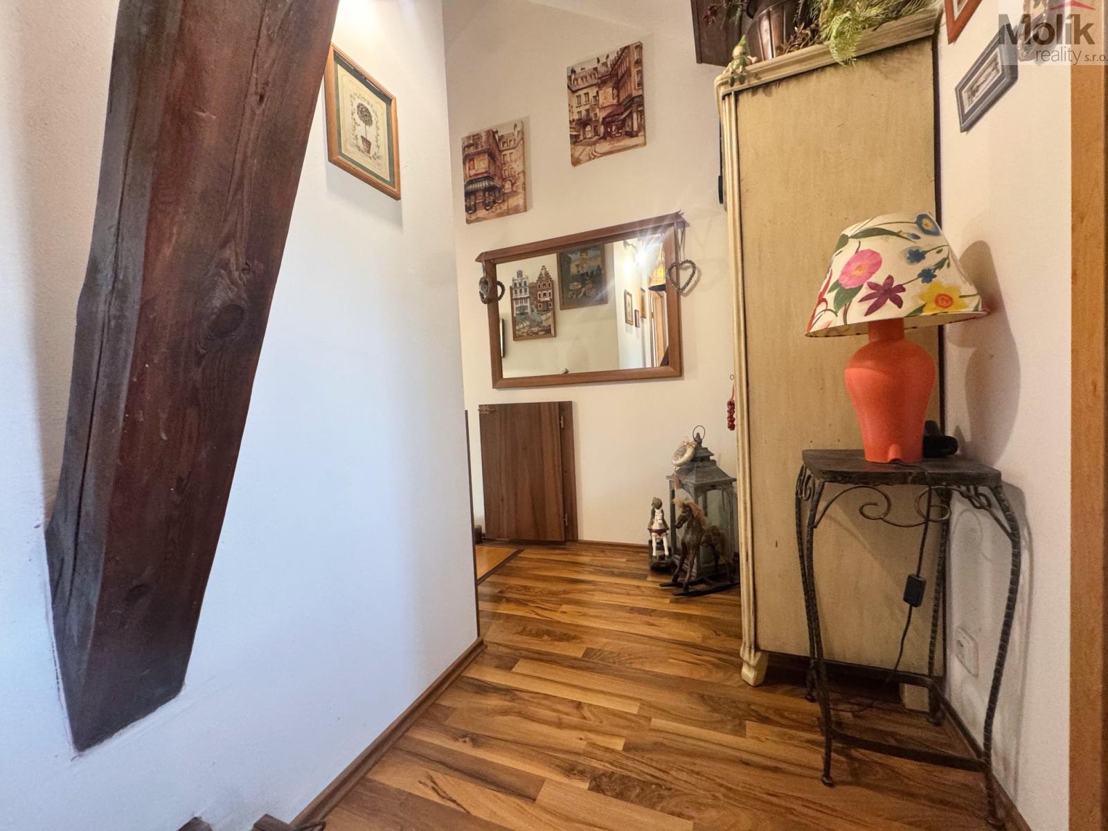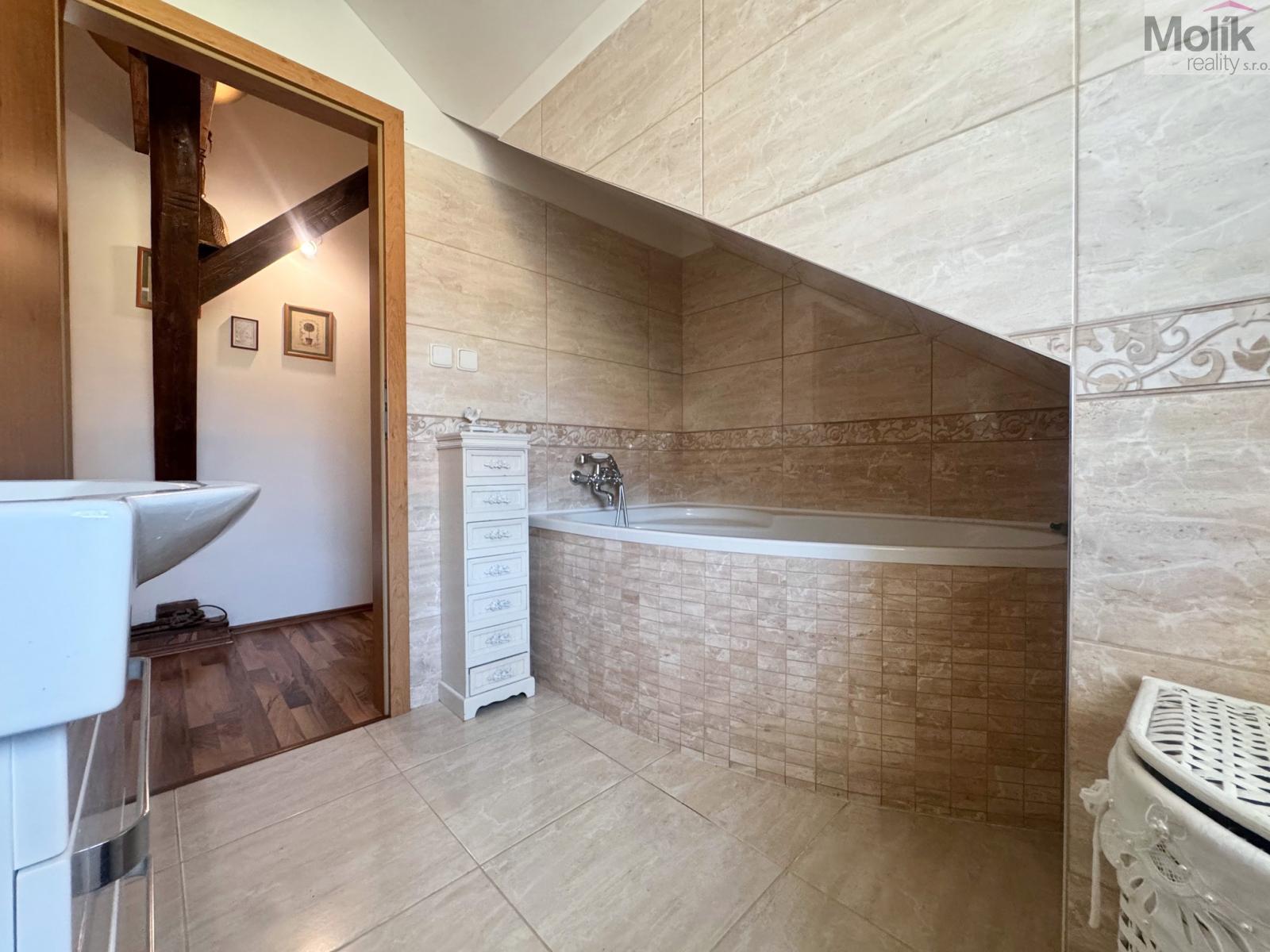 Podkroví: Horní patro nabízí dvě ložnice s nezaměnitelným charakterem díky přiznaným dřevěným trámům. Skutečným klenotem je hlavní ložnice, ze které je přímý vstup na soukromou terasu ideální místo pro ranní kávu nebo večerní odpočinek. V tomto patře se nachází také druhá, velkorysá koupelna s vanou a toaletou.