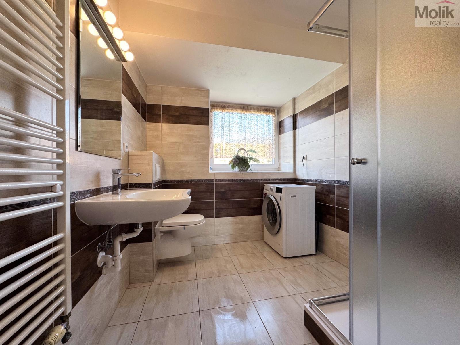Přízemí bytu: Srdcem domova je prostorný obývací pokoj s kuchyňským koutem, který je díky velkým oknům krásně prosvětlený. Dále zde najdete vstupní chodbu s vestavnou skříní a praktickou koupelnu se sprchovým koutem a toaletou. V této koupelně je prostor pro pračku i sušičku.