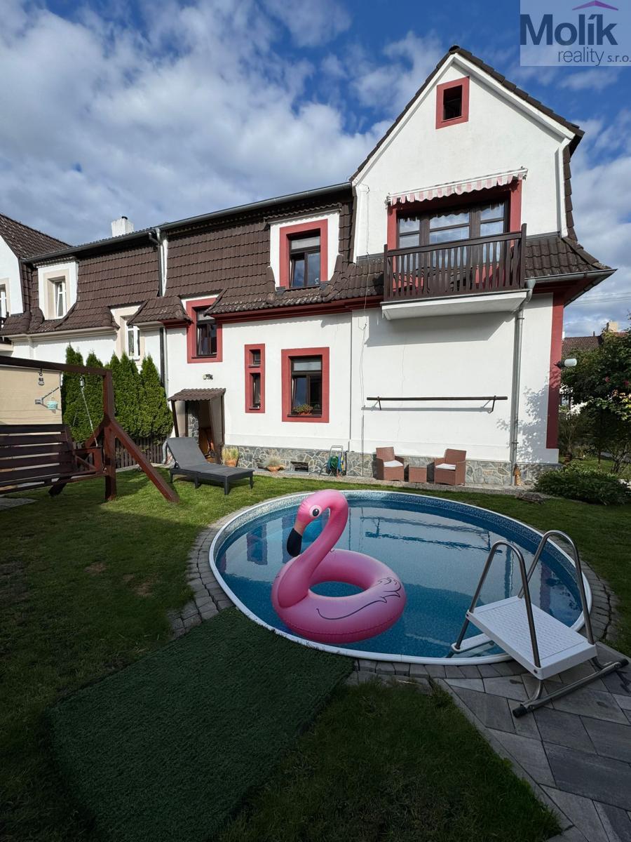 Na udržované a rovinaté zahradě se nacházejí vzrostlé stromy, zastřešená terasa se zděným grilem a zapuštěný bazén. Celá nemovitost působí velmi příjemně, útulně a je ve výborném stavu.