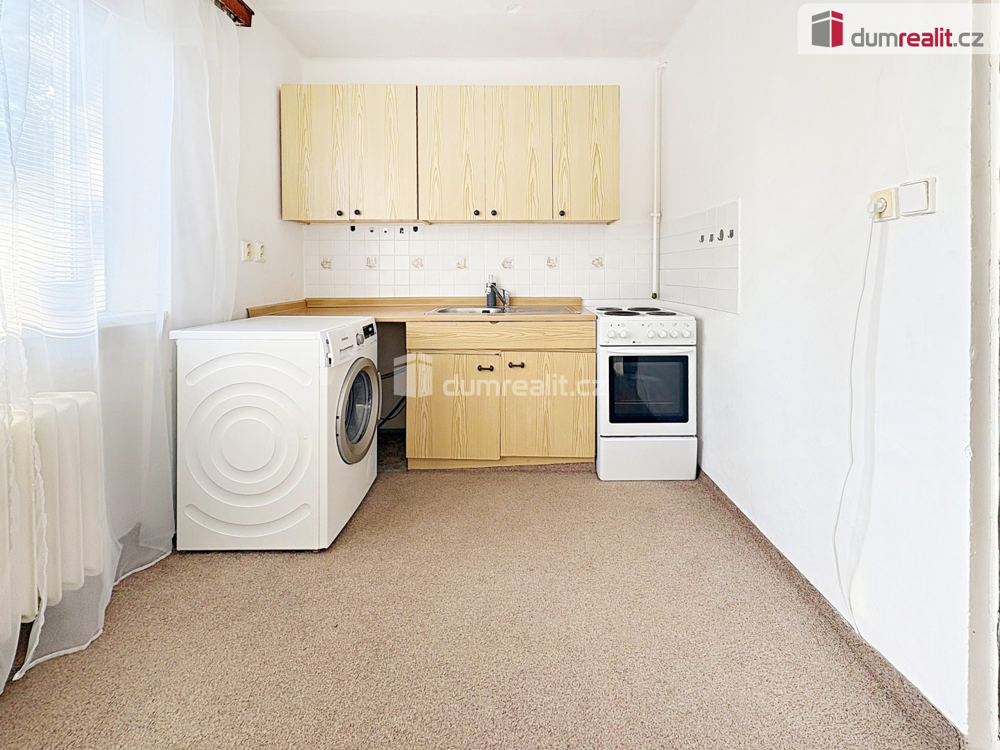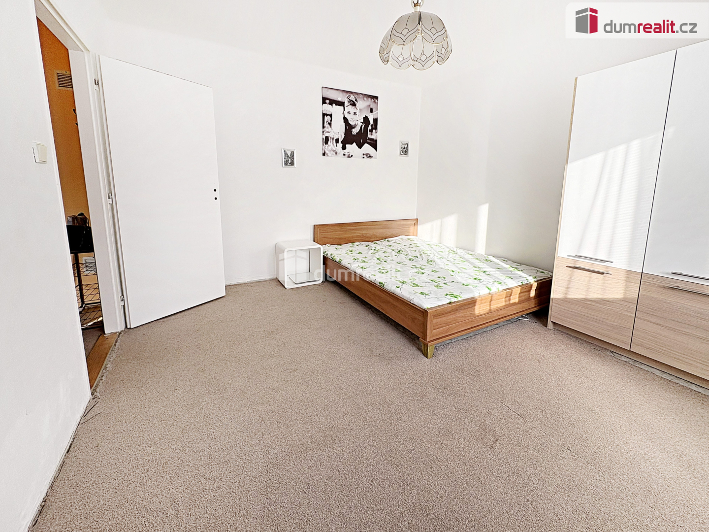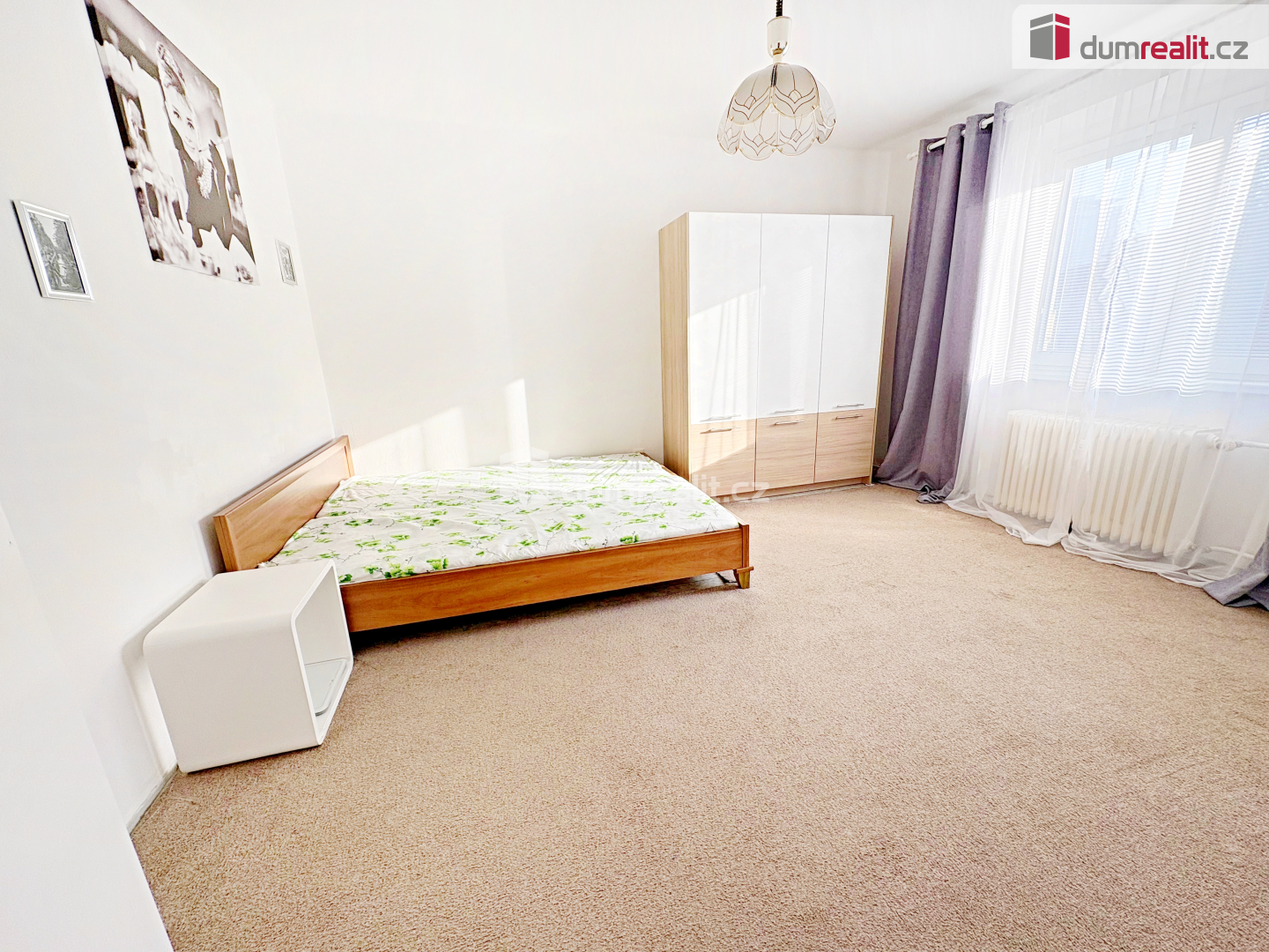Při vstupu do bytu je po pravé straně koupelna se vanou a WC. Na proti je kuchyň, kde se nachází kuchyňská linka s elektrickým sporákem, pračka, lednice a stůl se židlemi. V samostatném pokoji je manželská postel a skříň. V bytě jsou plastová okna, topení a ohřev vody je dálkově.