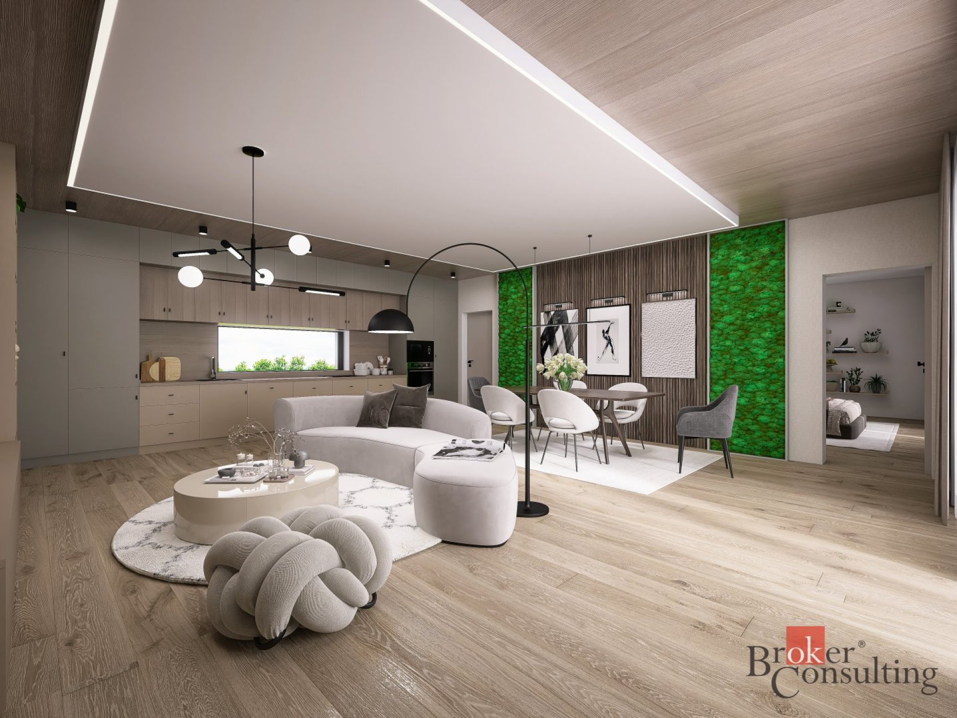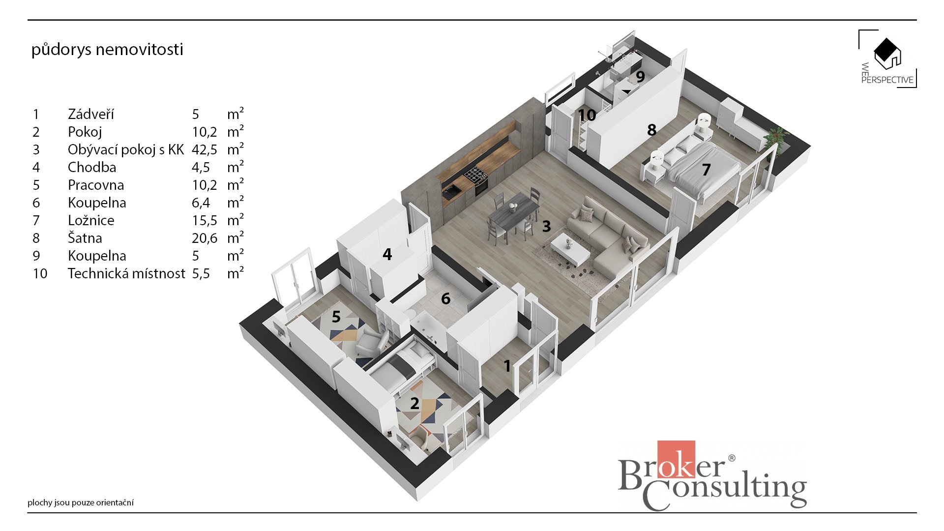 - prostorný obývací pokoj s kuchyňským koutem (42,5 m²) a vstupem do technické místnosti