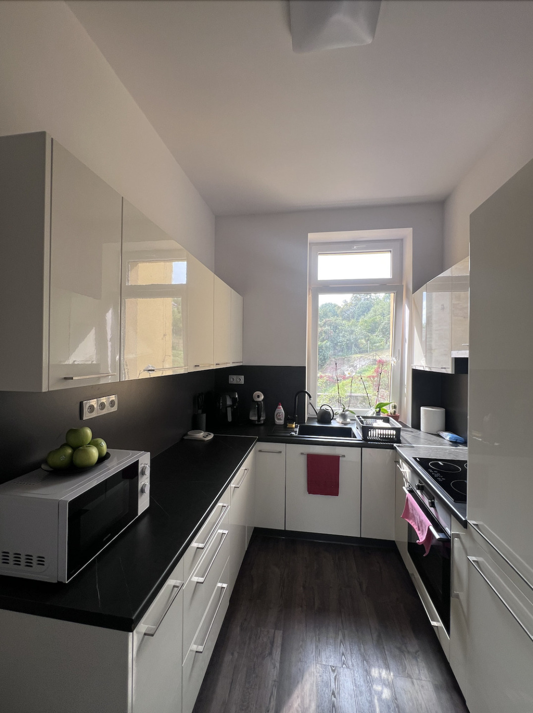 Byt má praktické uspořádání – prostorný pokoj, který lze využít jako ložnici s obývacím koutem, a samostatnou kuchyň s kompletně vybavenou linkou (varná deska, trouba, myčka, lednice). Koupelna je vybavena sprchovým koutem, umyvadlem a toaletou.