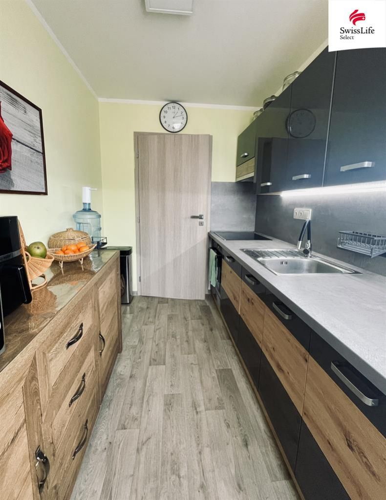 Kuchyň je rovněž přístupná z hlavní chodby. Moderní nová kuchyňská linka splňuje veškeré nároky na prostor v panelovém bytě, vše je zde chytře po ruce. Tlumené tóny tmavě šedé ladí s dřevěným dekorem.