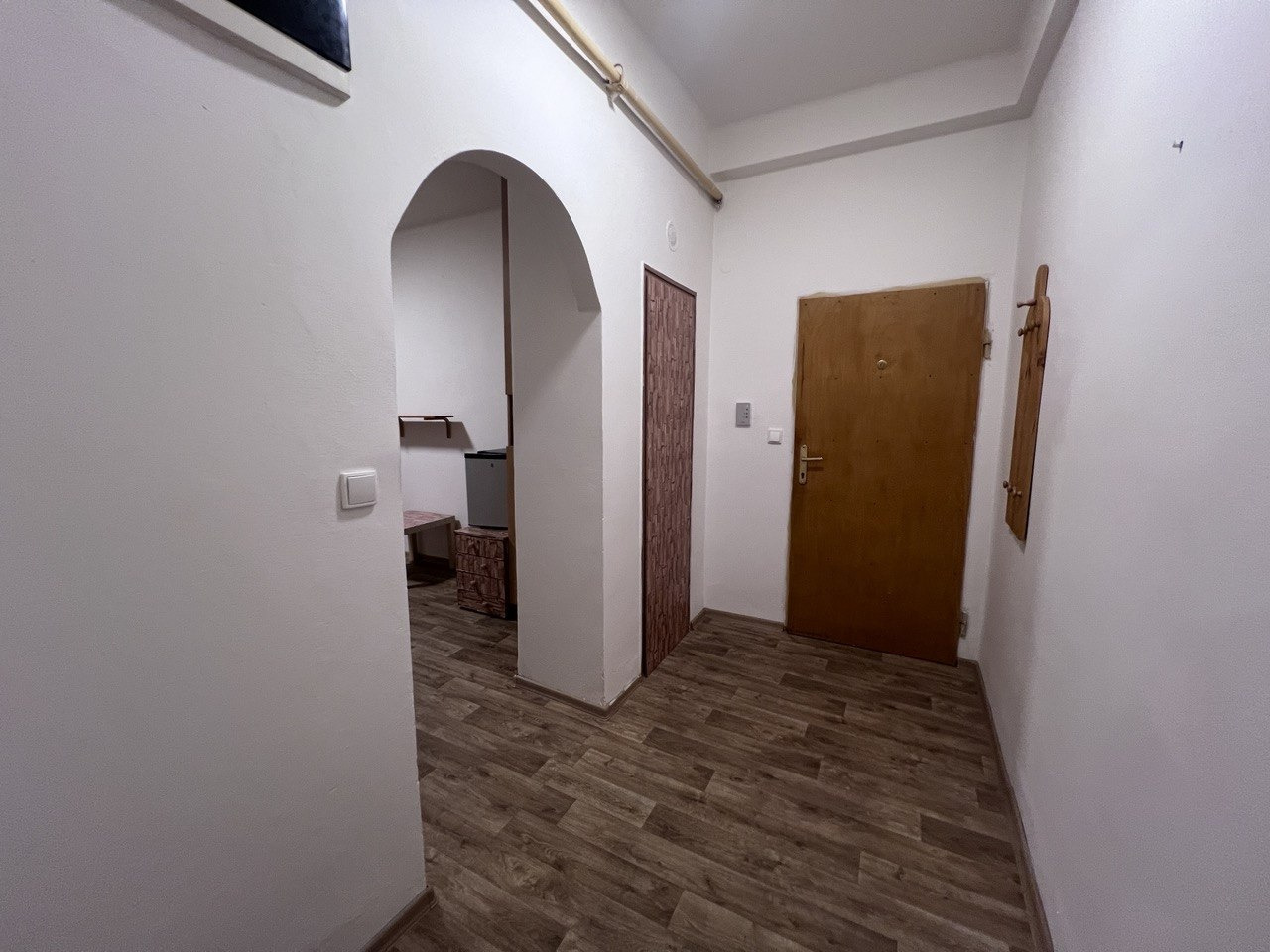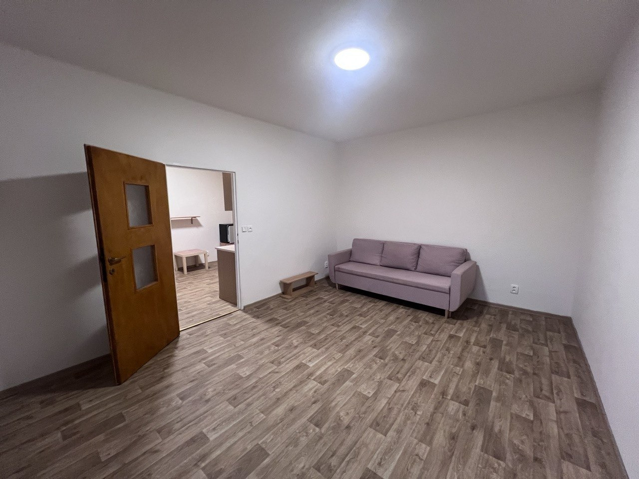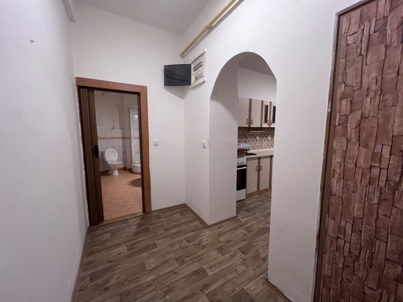 Byt nabízí praktické řešení, které zahrnuje obývací pokoj s kuchyňskou linkou, prostornou ložnici, koupelnu s vanou a WC a komoru. Všechny místnosti jsou světlé a nabízejí dostatek prostoru pro pohodlné bydlení.