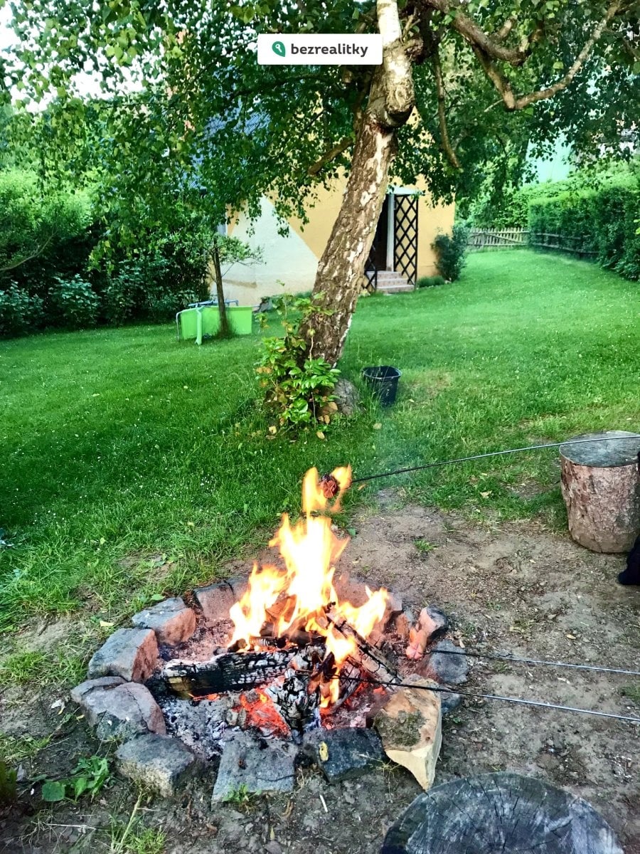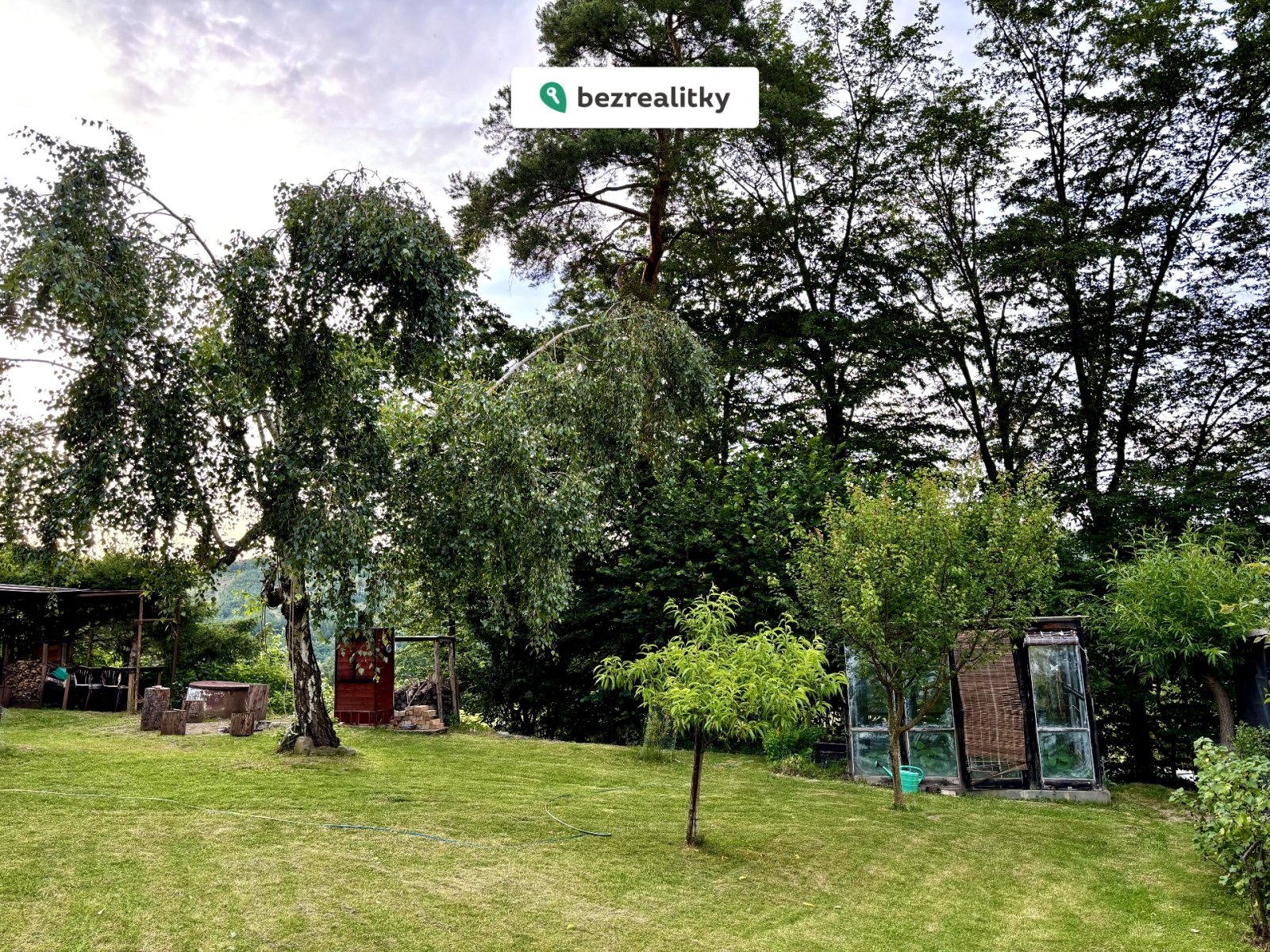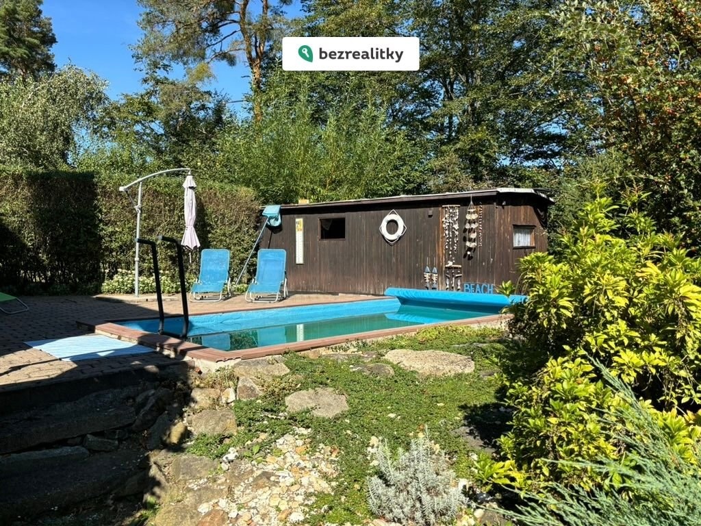 Pozemek okolo chaty včetně kousku lesa se vzrostlými stromy o celkové výměře 760 m² nabízí rozmanité využití. V zahradě s ovocnými stromy a keři najdete oddělenou sekci se zakrývatelným bazénem o rozměrech 5 x 3 m a vlastní filtrací. Prostor kolem bazénu nabízí perfektní zázemí pro relaxaci s dostatkem soukromí i výhledem do korun stromů a na okolní krajinu. Atmosféru tady dotváří hausbót, který v současnosti slouží jako praktická kůlna. V letních měsících vás potěší také skleník jako stvořený pro pěstování vlastní zeleniny. Na pozemku se nachází vlastní studna s vodou v kvalitě kojenecké vody. V zadní části zahrady se pak nachází ohniště, udírna s dřevníkem a posezení, odkud si můžete vychutnávat nádherný výhled. Večer se často na louce pod chatou pasou srnky, což ještě umocňuje pocit propojení s přírodou.